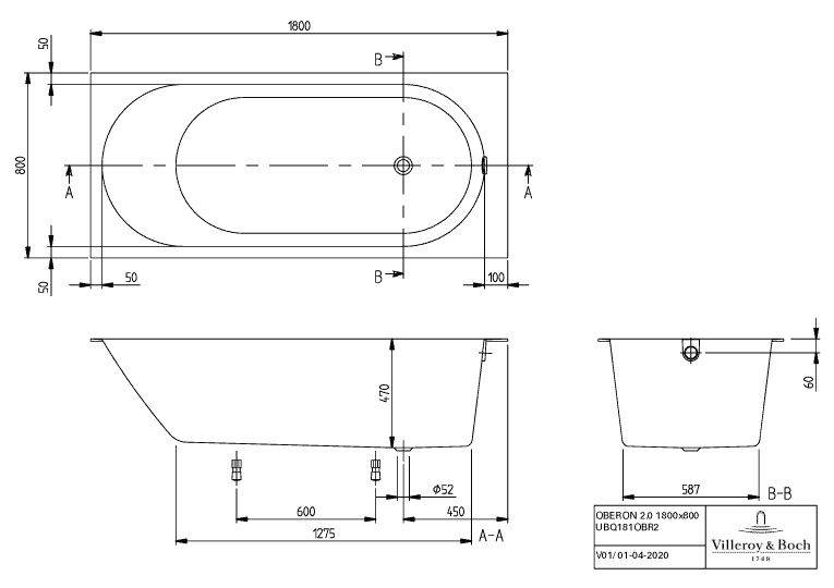 Villeroy & Boch Oberon 2.0 bad rechthoek 180x80cm wit