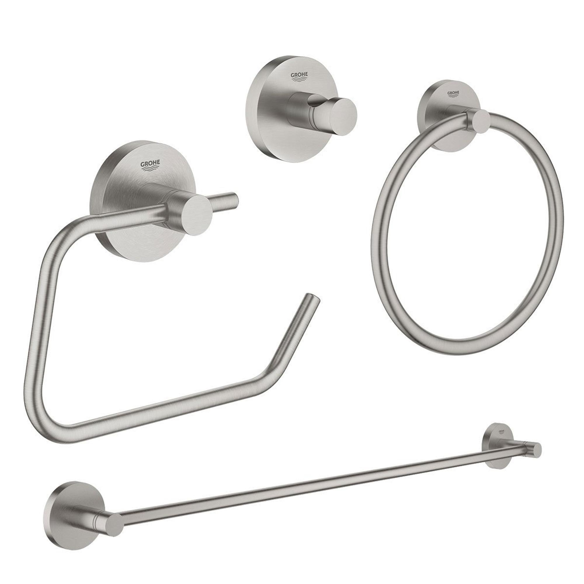 GROHE Essentials accessoireset 4-delig met handdoekring, handdoekhouder, handdoekhaak en toiletrolhouder zonder klep super steel