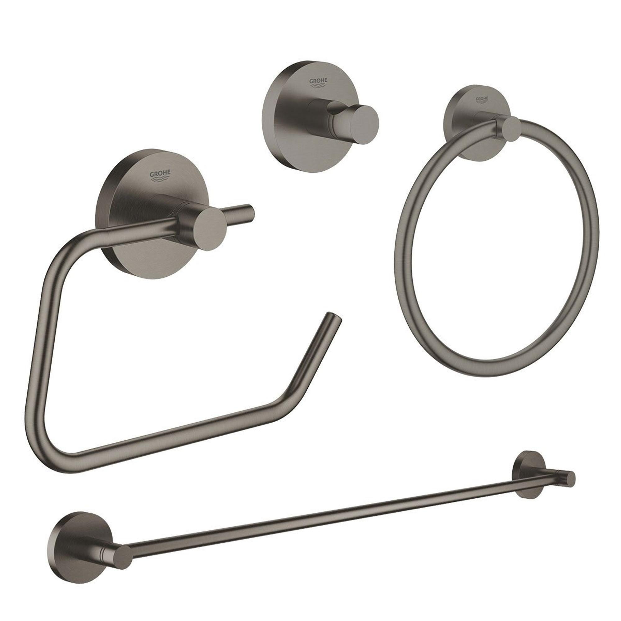 GROHE Essentials accessoireset 4-delig met handdoekring, handdoekhouder, handdoekhaak en toiletrolhouder zonder klep Brushed hard graphite