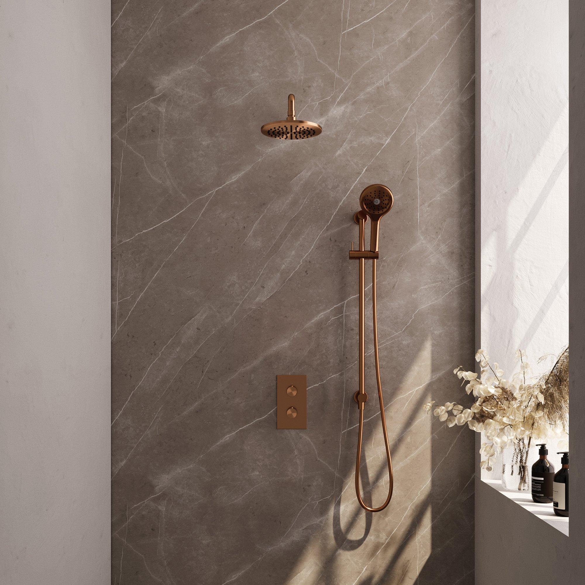 De Brauer Copper Edition Regendoucheset inbouw straalt stijl en klasse uit dankzij het unieke ontwerp en de hoogwaardige materialen. Het geborsteld koper geeft een warme en luxe uitstraling aan de set, waardoor het een eyecatcher wordt in je badkamer. De ronde vormen en gladde knoppen zorgen voor een harmonieus geheel dat perfect past bij zowel moderne als klassieke badkamerstijlen.