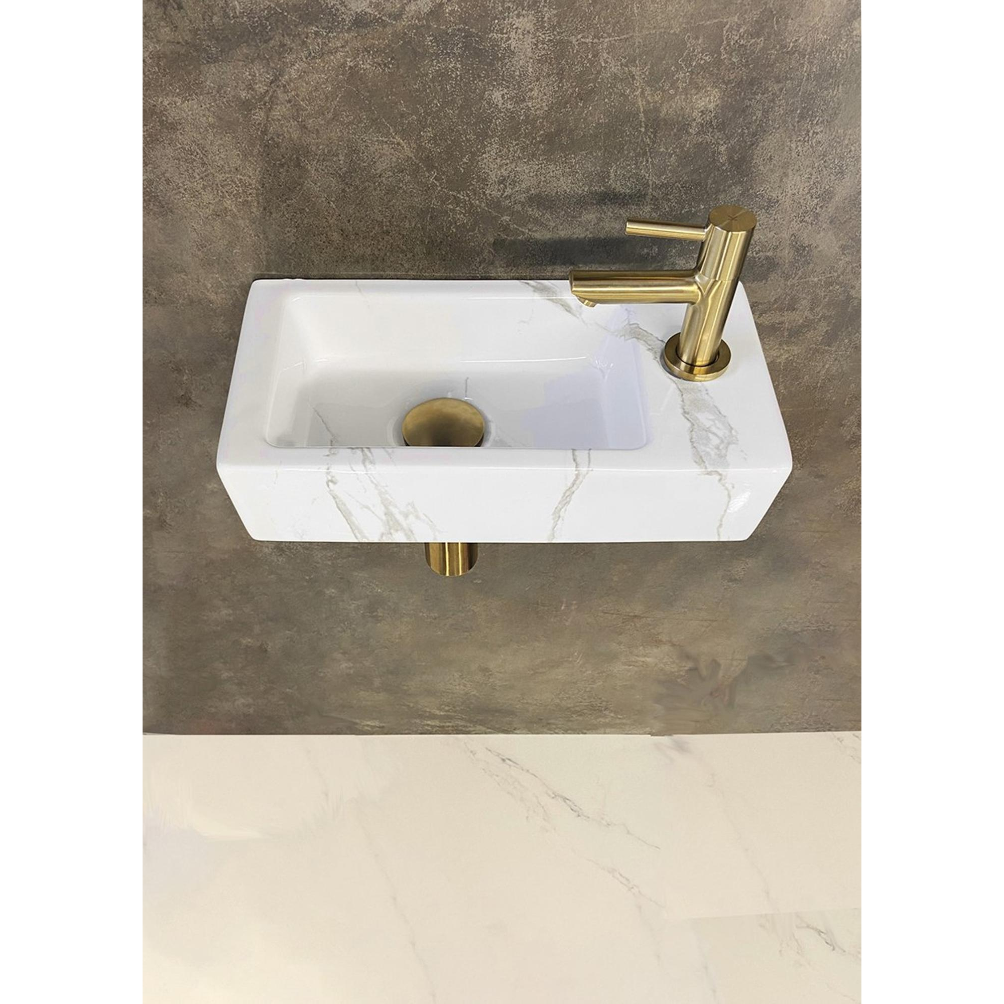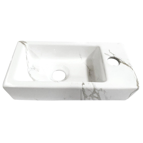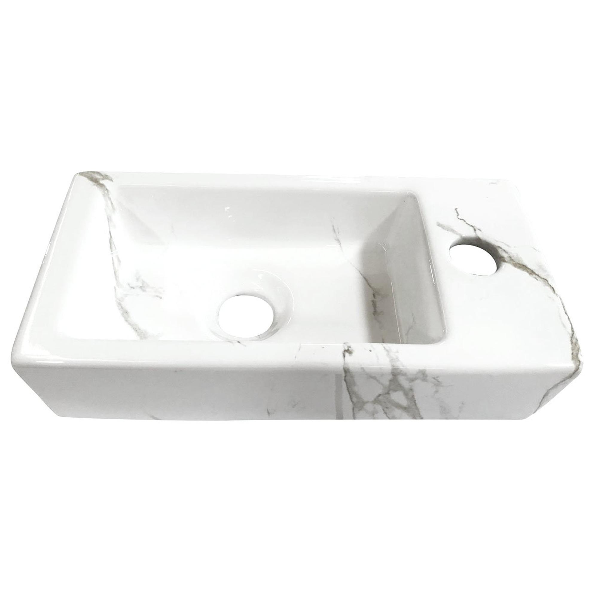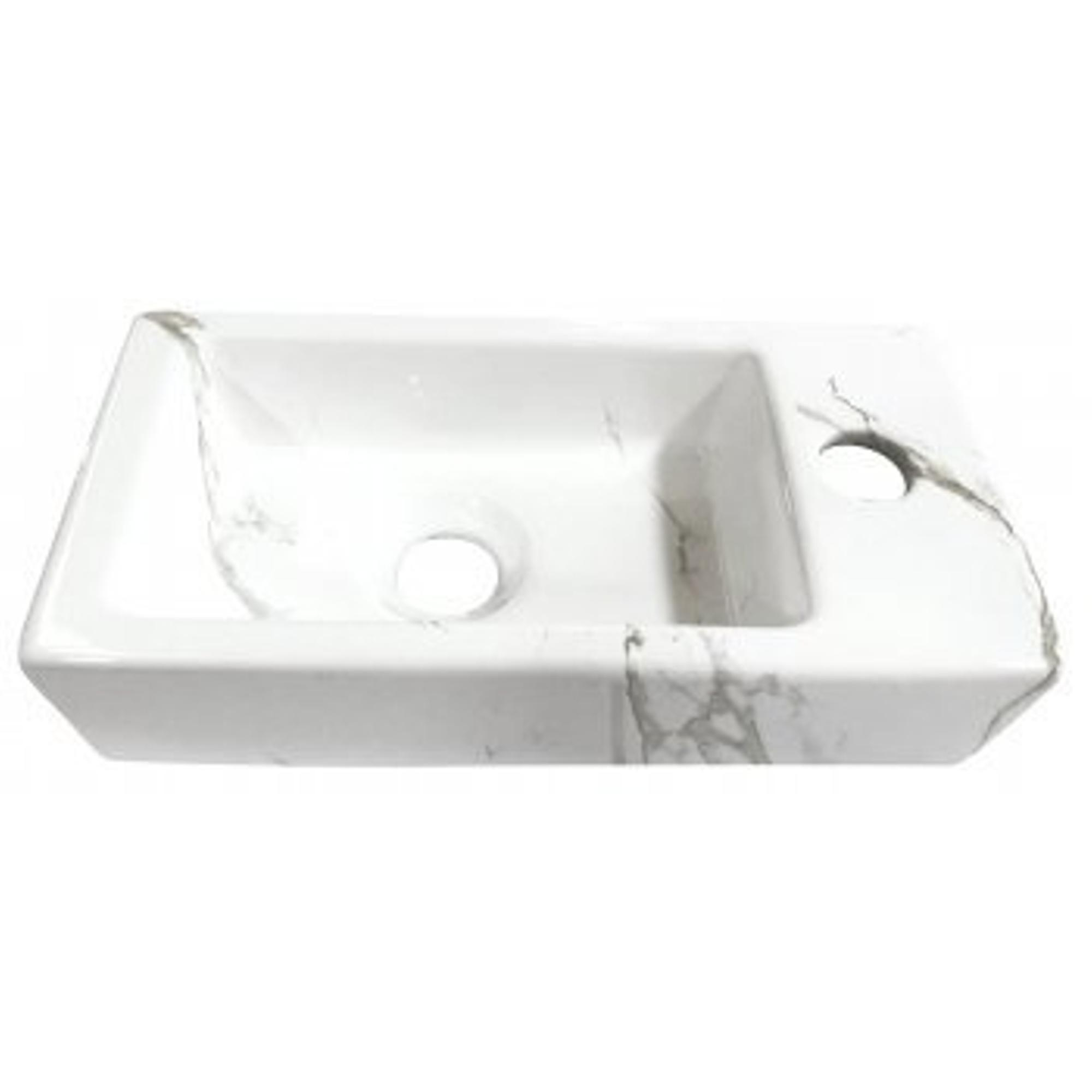 De Wiesbaden One Pack Mini-Rhea rechts fontein straalt elegantie uit in zijn eenvoudige en strakke ontwerp. De Carrara marmeren afwerking voegt een vleugje luxe toe, terwijl de compacte afmetingen ervoor zorgen dat het perfect past in kleine badkamers of toiletruimtes. Deze fontein is een combinatie van functionaliteit en esthetiek, waardoor het een tijdloze toevoeging is aan elke badkamer.
