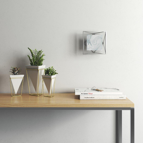 Geef de presentatie van je favoriete foto's en herinneringen een nieuwe dimensie! Nieuw: de PRISMA-lijstencollectie van Umbra. Ben je eens op zoek naar iets anders dan een standaard fotolijst of wil je eens iets dynamischers aan de muur hangen? Dan is de PRISMA misschien wel een goede optie. Met de PRISMA-lijstencollectie van Umbra kun je zorgen voor meer afwisseling en diepte in je foto's, op een manier die gegarandeerd de aandacht trekt. Dit prismatische draadframe laat je foto zweven tussen twee glasplaten. Tegelijkertijd komen de draden door de voorkant van de lijst heen, wat zorgt voor een unieke en ultramoderne uitstraling. Met de PRISMA kun je gedenkwaardige foto's van vakanties, bruiloften, diploma-uitreikingen of familiefotoshoots laten zien, of andere soorten kunst zoals grafische teksten, illustraties, tekeningen, schetsen, kaarten, patronen of andere unieke voorwerpen. Of je de PRISMA nu aan de wand hangt of gebruikt als tafeldecoratie, je kunt uitgebreid variëren met indelingen. Hangend en staand, verticaal en horizontaal. Met alle variatie in afwerkingen en formaten die de PRISMA-lijstencollectie te bieden heeft, vind je gegarandeerd iets dat bij jouw stijl past! Verkrijgbaar in vijf formaten: voor foto's van 10 x 10 cm (afmetingen 15,3 x 15,3 x 7,6 cm), 10 x 15 cm (afmetingen 15,3 x 20,3 x 7,6 cm), 13 x 18 cm (afmetingen 17,8 x 22,9 x 7,6 cm) en 20 x 25 cm (afmetingen 25,4 x 30,5 x 7,6 cm), en in een multi-uitvoering voor drie foto's van 13 x 18 cm (afmetingen (48,3 x 22,9 x 8,1 cm). De PRISMA is verkrijgbaar in de kleuren koper, mat messing, zwart en chroom. Op zoek naar een manier om je fotogalerij een nieuwe dimensie te geven? Bestel dan nu jouw PRISMA-fotolijst. Over Umbra: Een internationale ontwerpstudio van producten voor thuis met een origineel, modern, casual en functioneel design.
