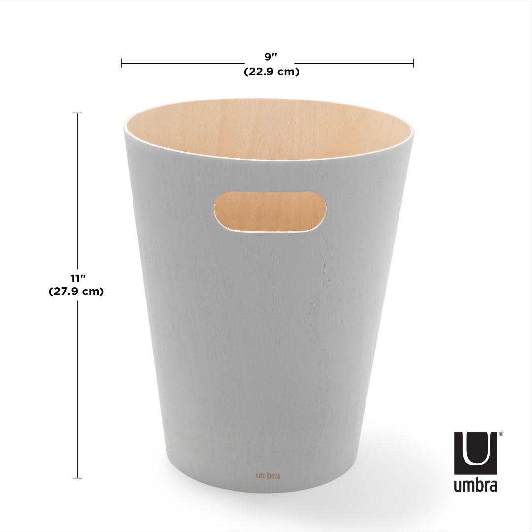 Meerdere uitvoeringenDe WOODROW is verkrijgbaar in diverse afwerkingen; alle varianten zijn aan de binnenkant afgewerkt met natuurlijk hout. Hij heeft geïntegreerde handvatten waarmee hij eenvoudig te verplaatsen is en waarmee (recycling)afval eenvoudig weggegooid kan worden. De WOODROW heeft een diameter van 22,9 cm, een hoogte van 27,9 cm en een capaciteit van 7,5 liter, ideaal voor kleine ruimten.