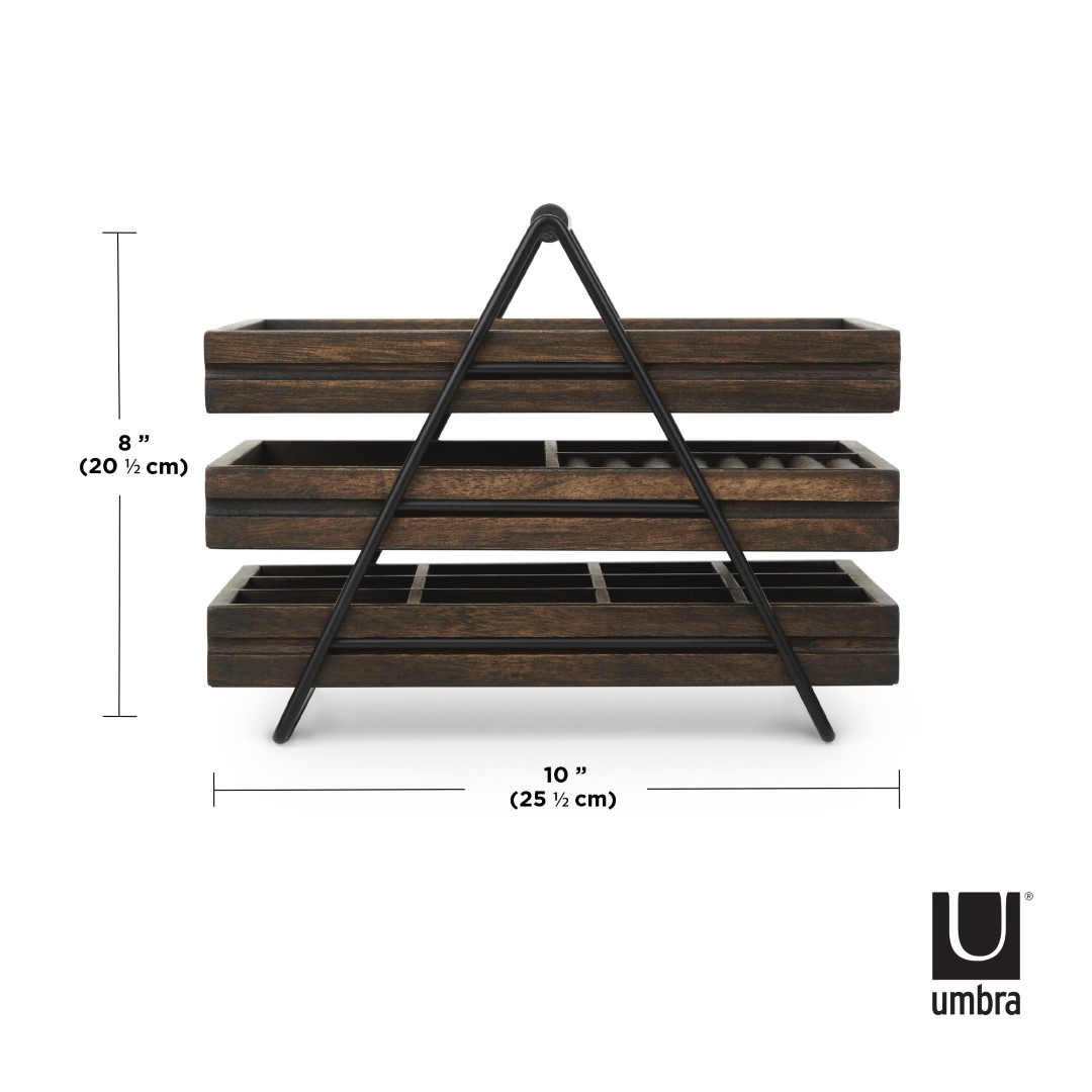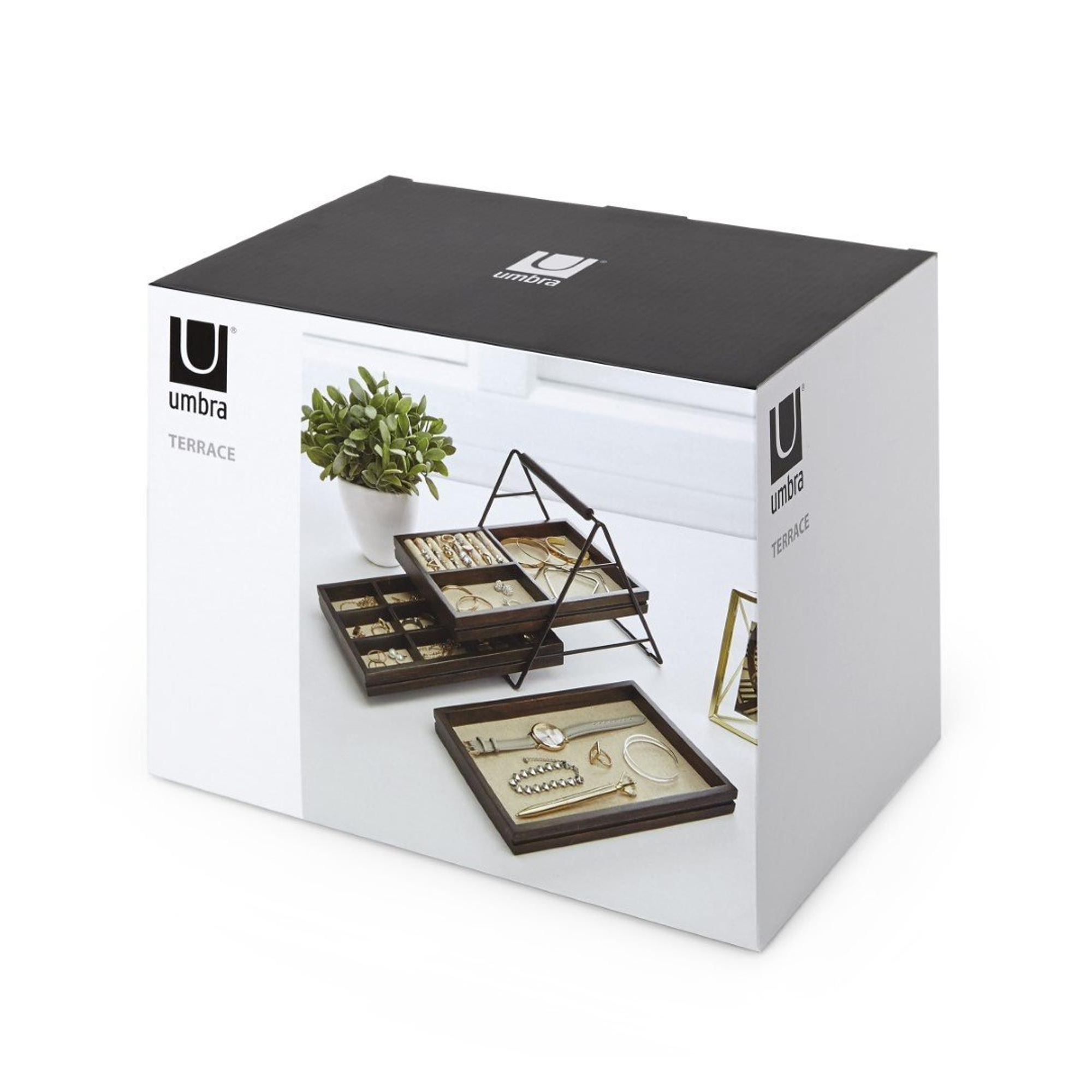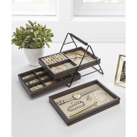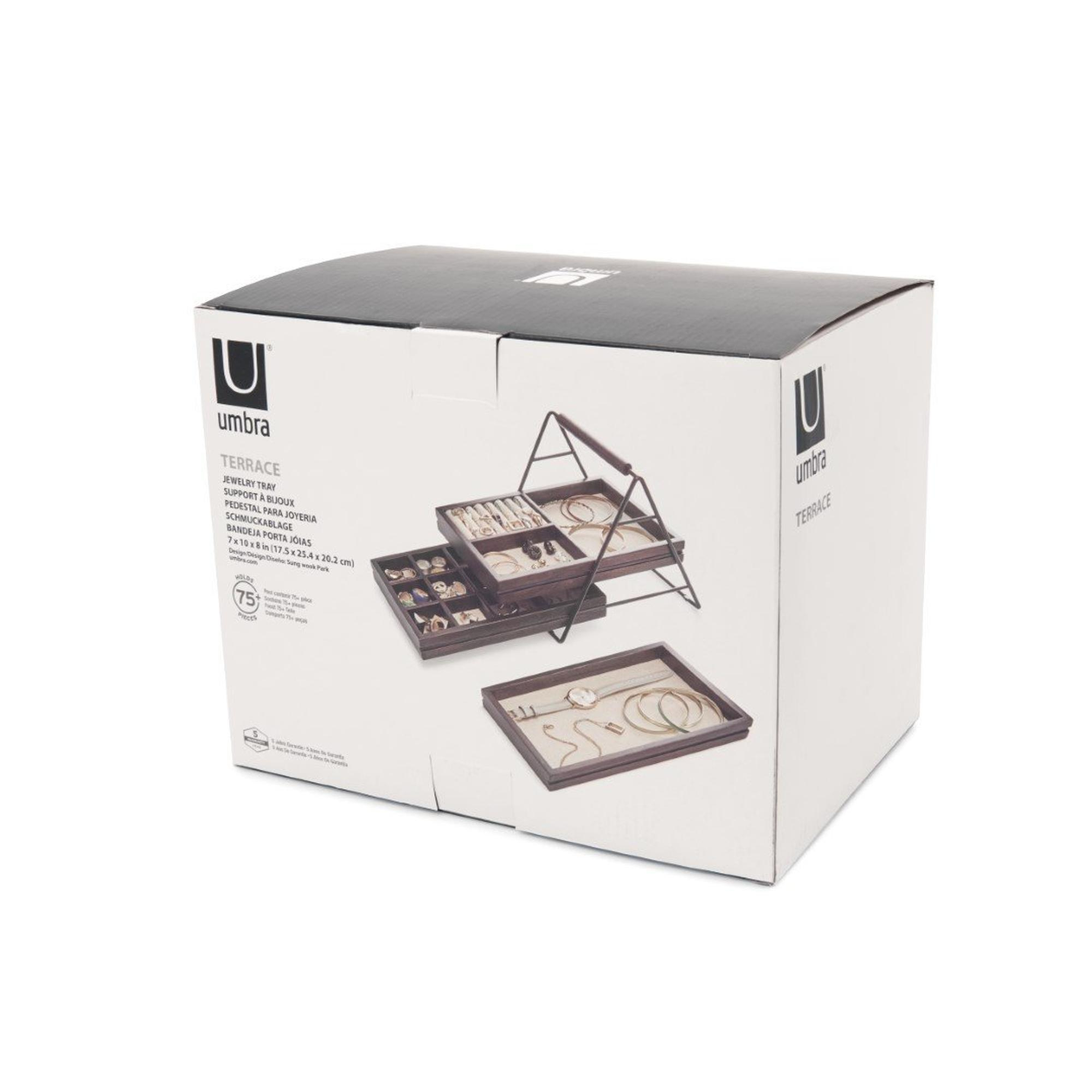 Voor veel mensen zijn sieraden misschien wel hun meest waardevolle bezittingen. Het is heel begrijpelijk dat je die waardevolle accessoires wilt bewaren in een mooie houder waarin ze goed beschermd en netjes georganiseerd zijn. Met deze elegante en slim ontworpen set gestapelde trays van Umbra is de oplossing (en je sieraden) binnen handbereik. De Terrace-sieradenhouder bestaat uit drie gestapelde trays. Elke tray heeft tussenschotten die geoptimaliseerd zijn voor een bepaald soort sieraad en die de sieraden netjes op hun plek houden. Dankzij de zachte linnen bekleding blijven je accessoires mooi en blijven ze netjes op hun plek liggen.
