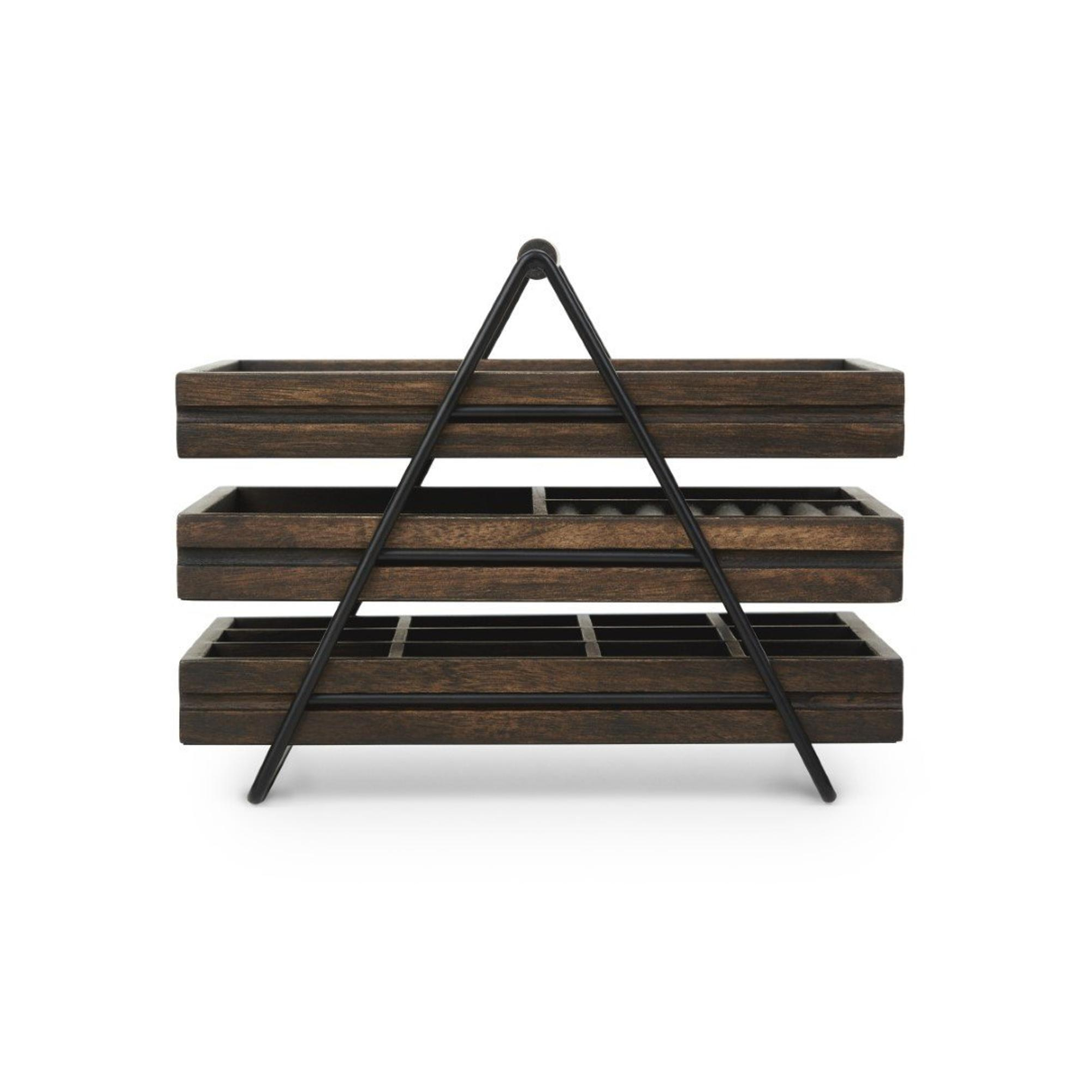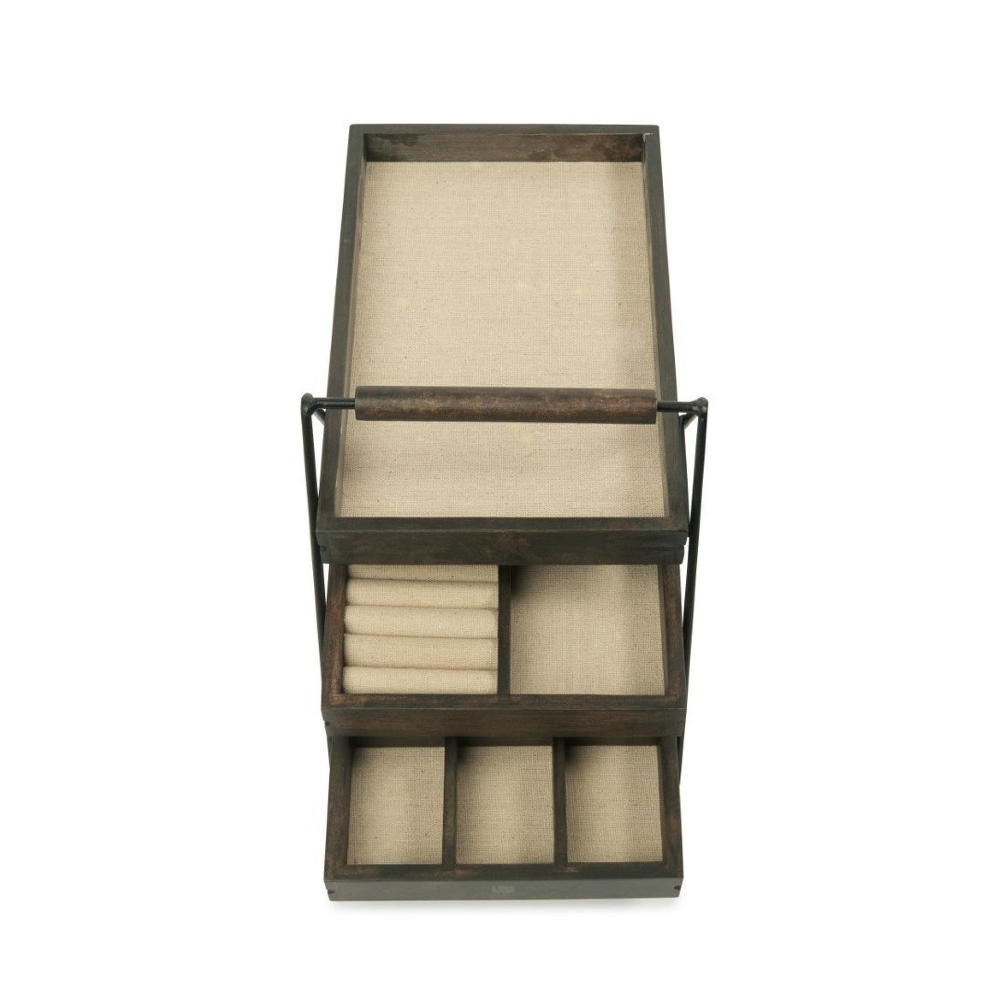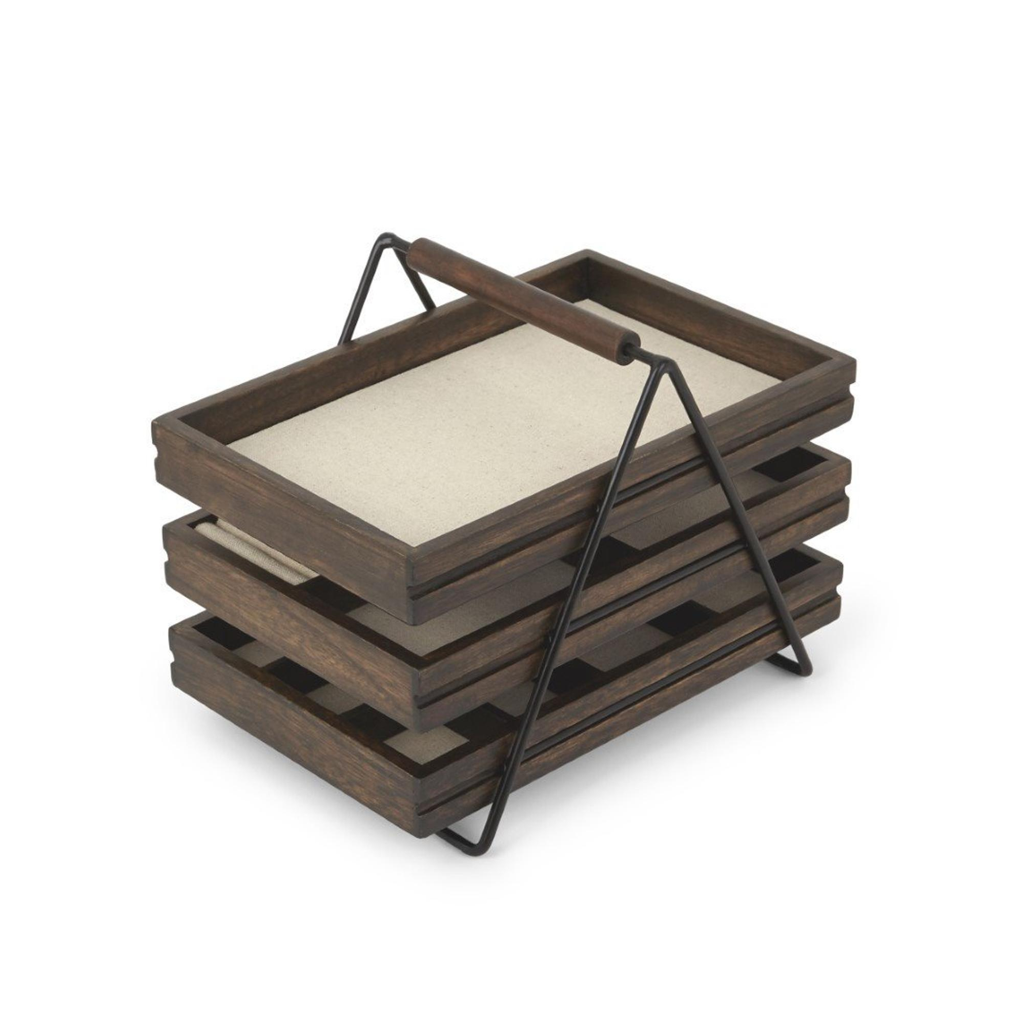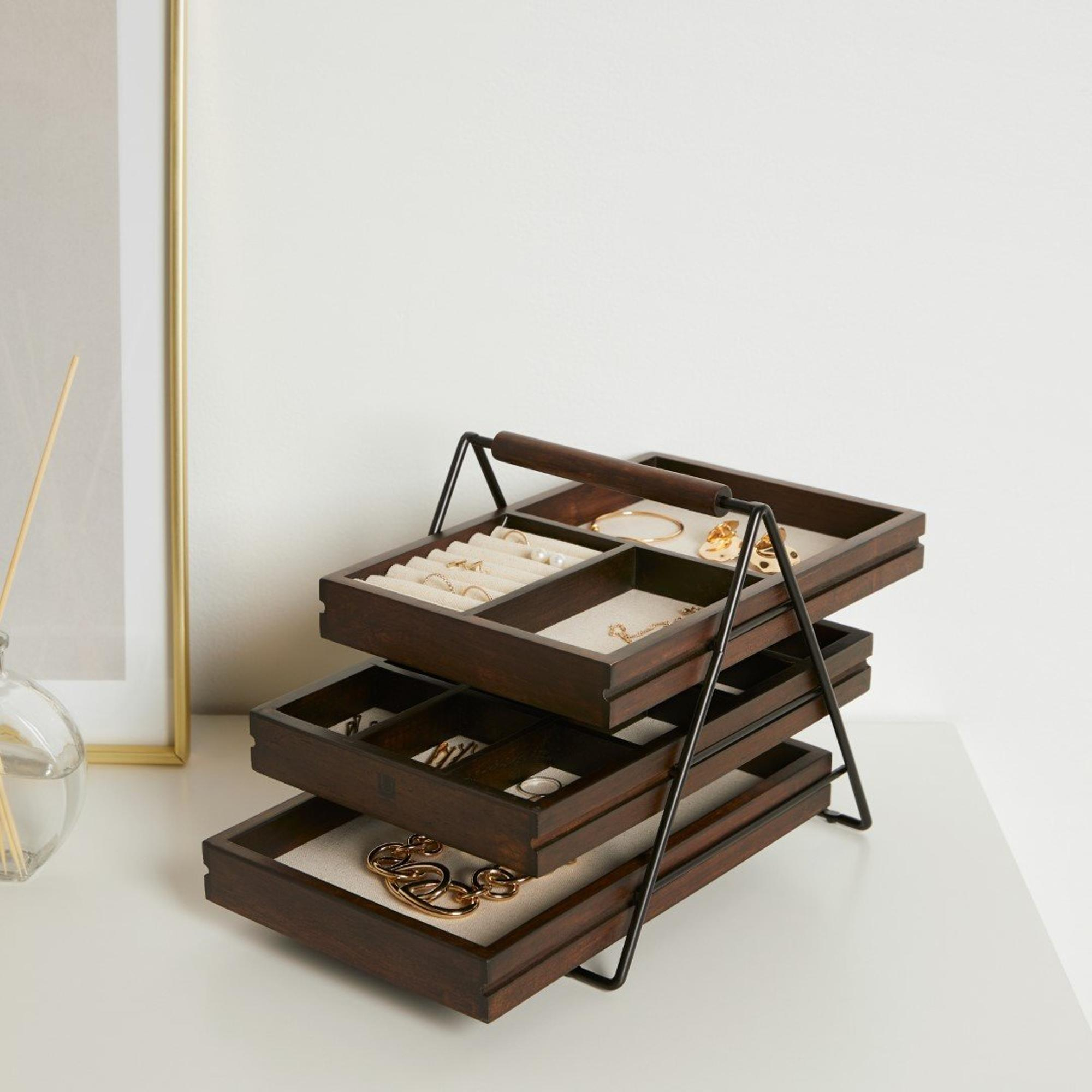 Drie houten sieradentrays op elkaarDe sieradentrays van de Terrace zijn uitschuifbaar zodat je makkelijk bij je accessoires kunt, en hij heeft speciaal ontworpen tussenschotten met een linnen bekleding zodat je ze netjes kunt organiseren. Dankzij een makkelijke handgreep is hij eenvoudig te transporteren.