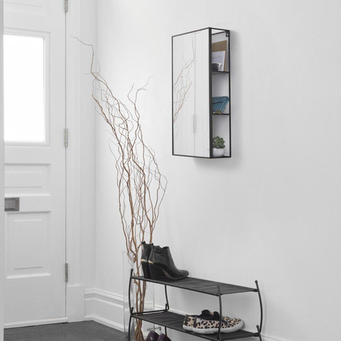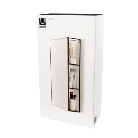 Een spiegel waarmee je alles uit een kleine woonruimte haalt. Nieuw: de CUBIKO-spiegel met opbergruimte van Umbra. Achter de CUBIKO-spiegel hangen drie planken waar je uit het zicht spullen kwijt kunt. Een veelzijdig product voor accessoires, badkamerproducten, sleutels en meer. Ideaal voor in de badkamer of de gang. Robuust: De constructie van de CUBIKO is gemaakt van gepoedercoat metaal. Daarmee is hij ideaal voor badkamers en voor ruimten in huis waar veel mensen komen.