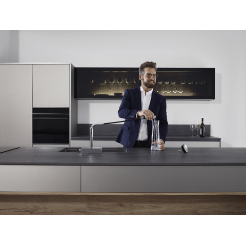 De moderne L-uitloop komt boven een prominent podium uit. Daar heeft hansgrohe de revolutionaire SatinFlow-straalsoort ondergebracht. Een zijdezachte, grote douchestraal die bestaat uit 133 ultrafijne afzonderlijke stralen, omhult kwetsbaar voedsel op een zachte en efficiënte manier. Samen met de geleverde multifunctionele zeef F14 resulteert dit in een optimale workflow en wordt het werken in de keuken een plezier.