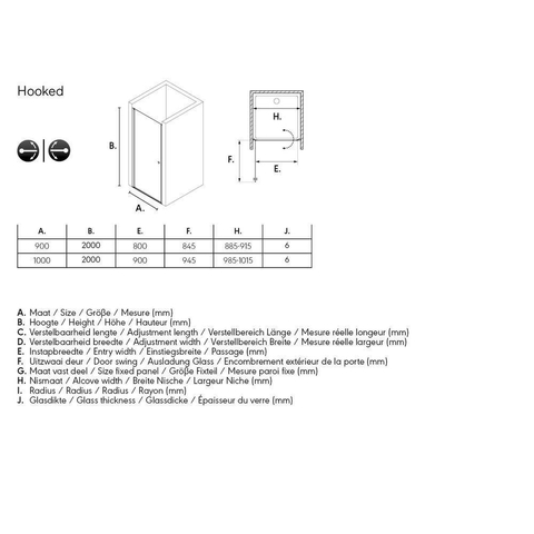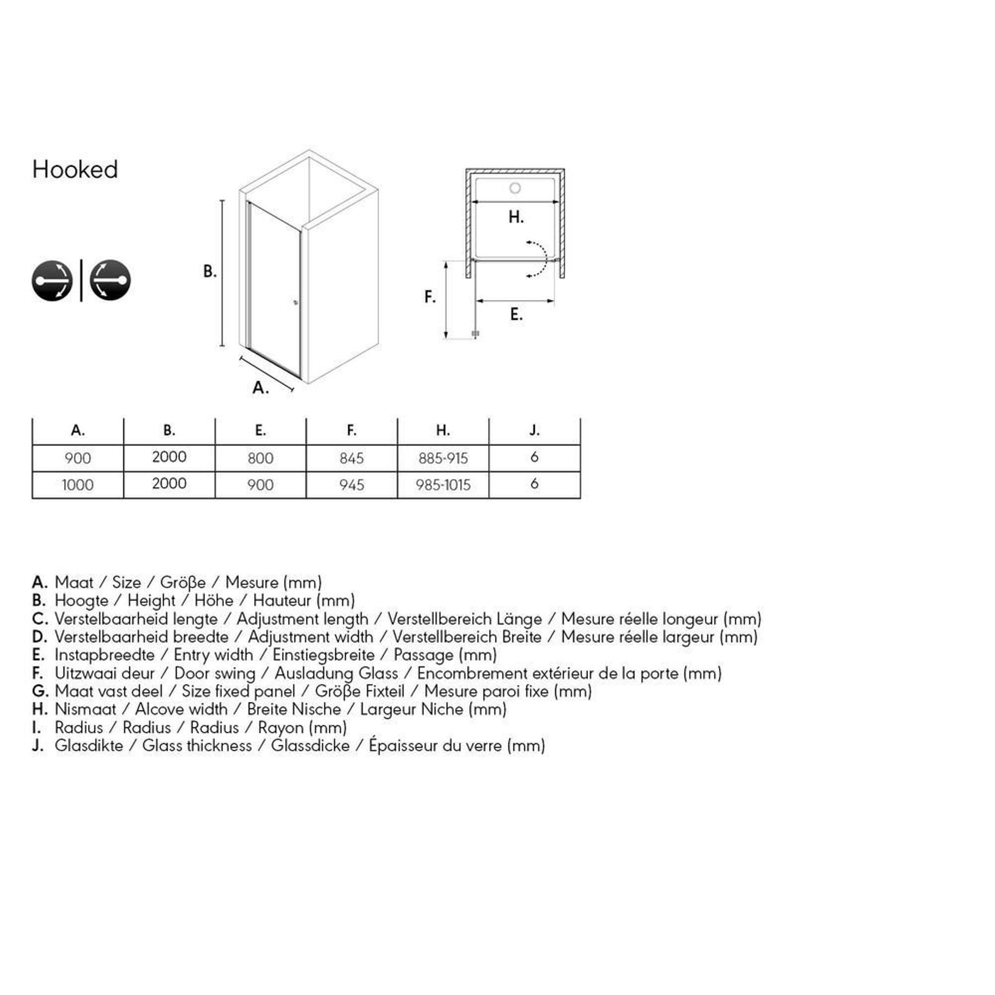 Deze draaideur voor plaatsing in een nis van 100 cm uit de serie Hooked kenmerkt zich door zijn hoogte van 200 cm én het gemak in onderhoud. Het 6 mm dikke heldere veiligheidsglas heeft een antikalk coating, zodat het glas ook langer helder blijft.