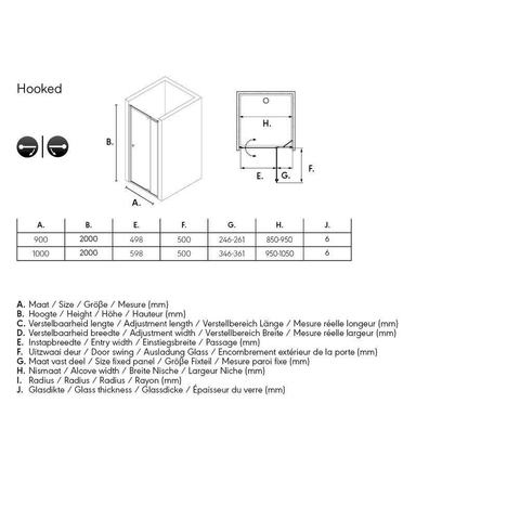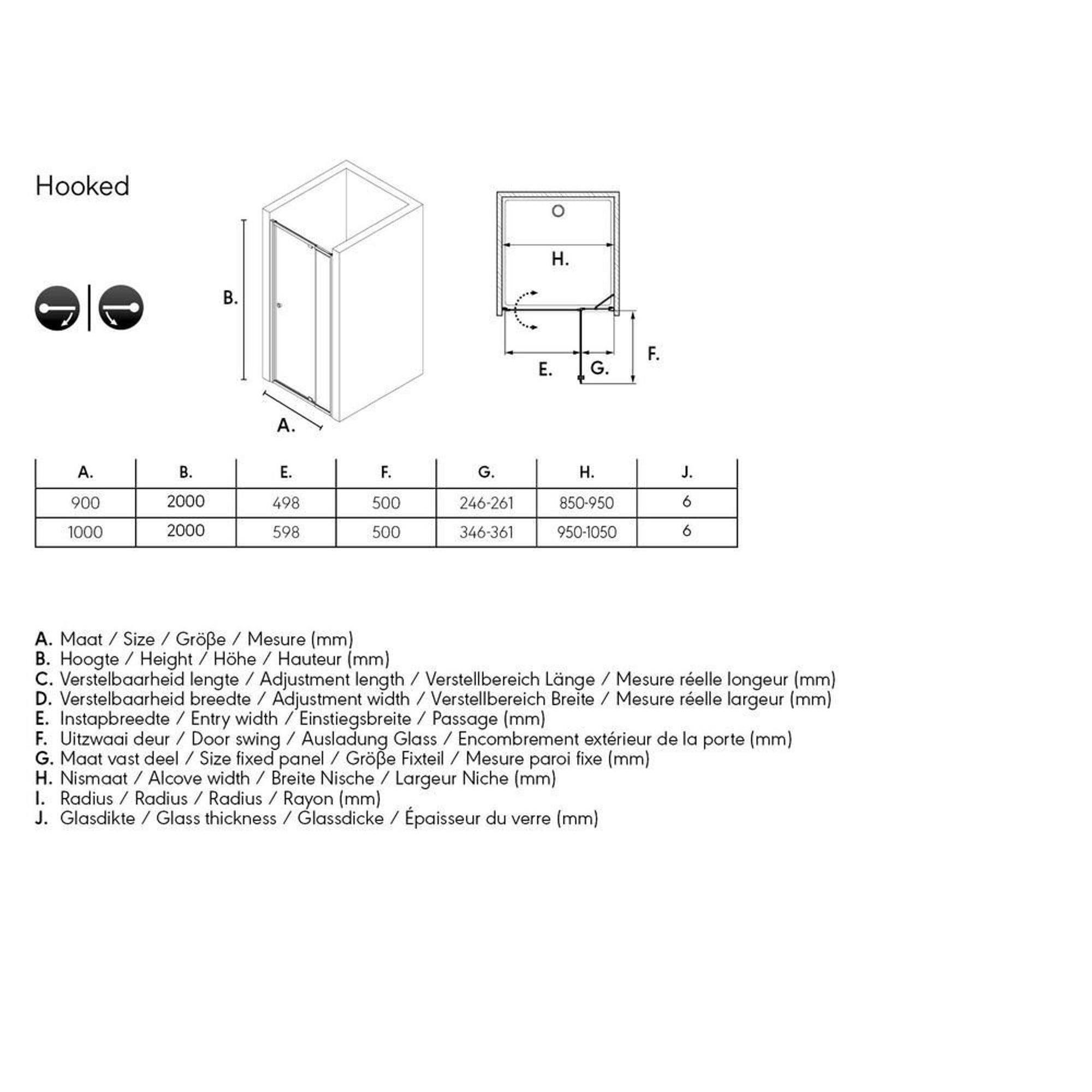 Deze draaideur voor plaatsing in een nis van 100 cm uit de serie Hooked past vrijwel altijd. Hij heeft namelijk een verstelbaarheid van maar liefst 10 cm. Als je muur niet waterpas staat of als je net niet goed uitkomt met een gewone cabine, dan kan je deze toch installeren