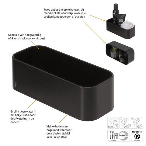 Monteren van het muurplaatje kan op twee manieren: plakken of schroeven. Als je liever niet in je tegels wil boren kun je de bijgeleverde TigerFix gebruiken. Deze lijm is te gebruiken op iedere gladde, stevige ondergrond en kan tot 10 kilo belast worden in een vochtige ruimte. Schroeven is natuurlijk ook een optie met de bijgeleverde RVS schroeven en Fischer pluggen zodat je ook buiten de badkamer gebruik kunt maken van dit multifunctionele bakje.