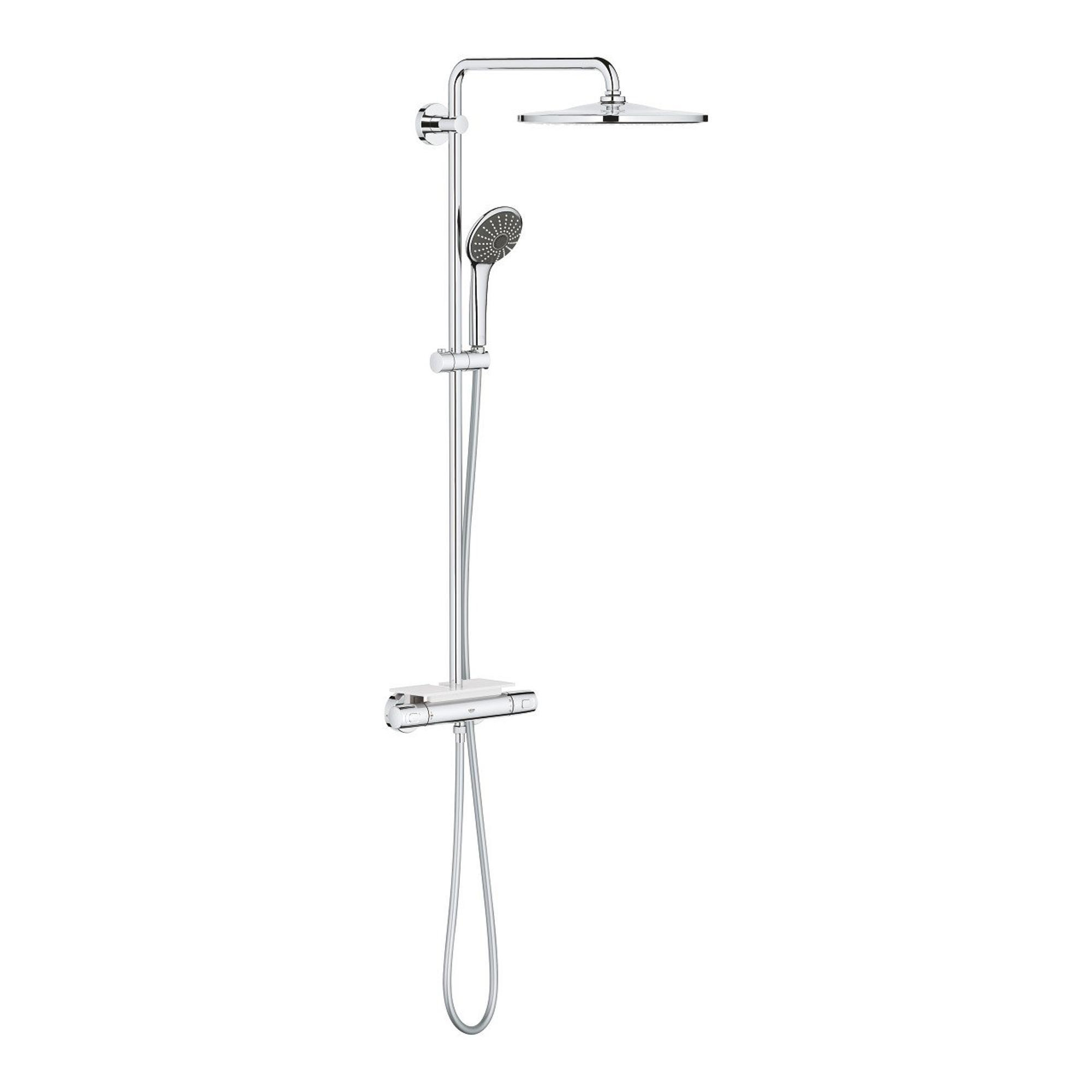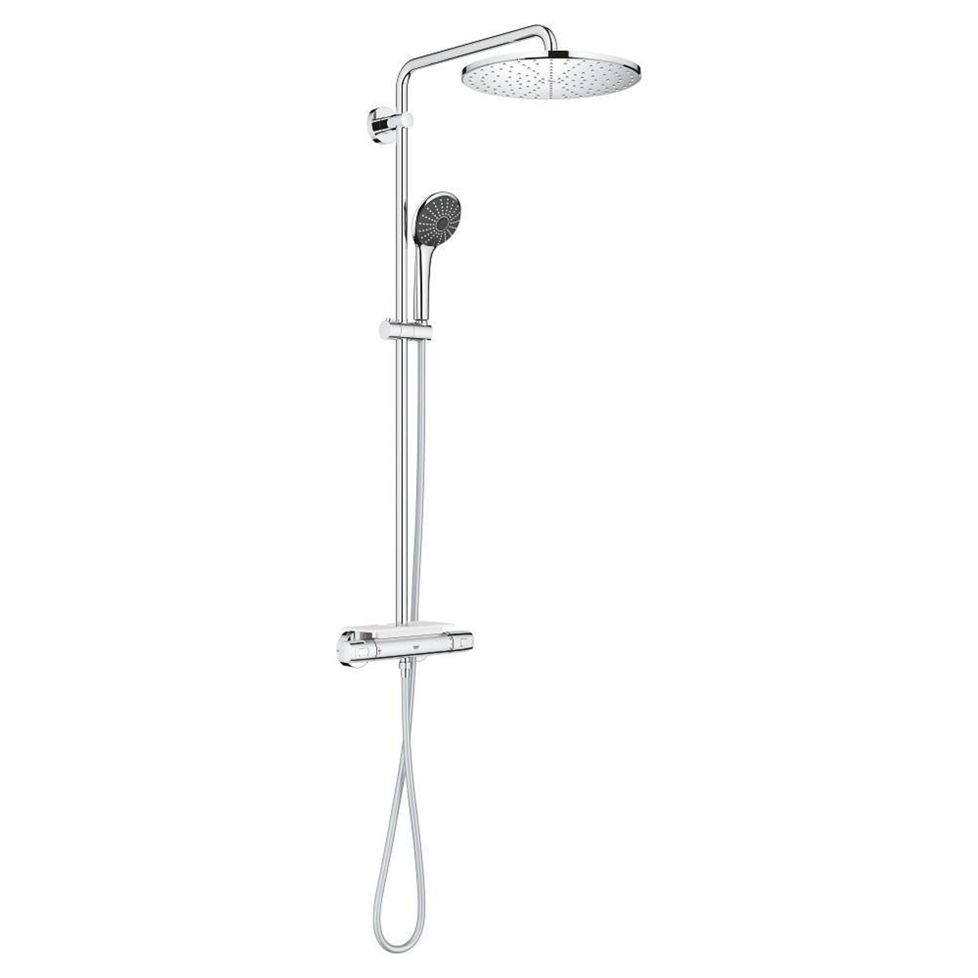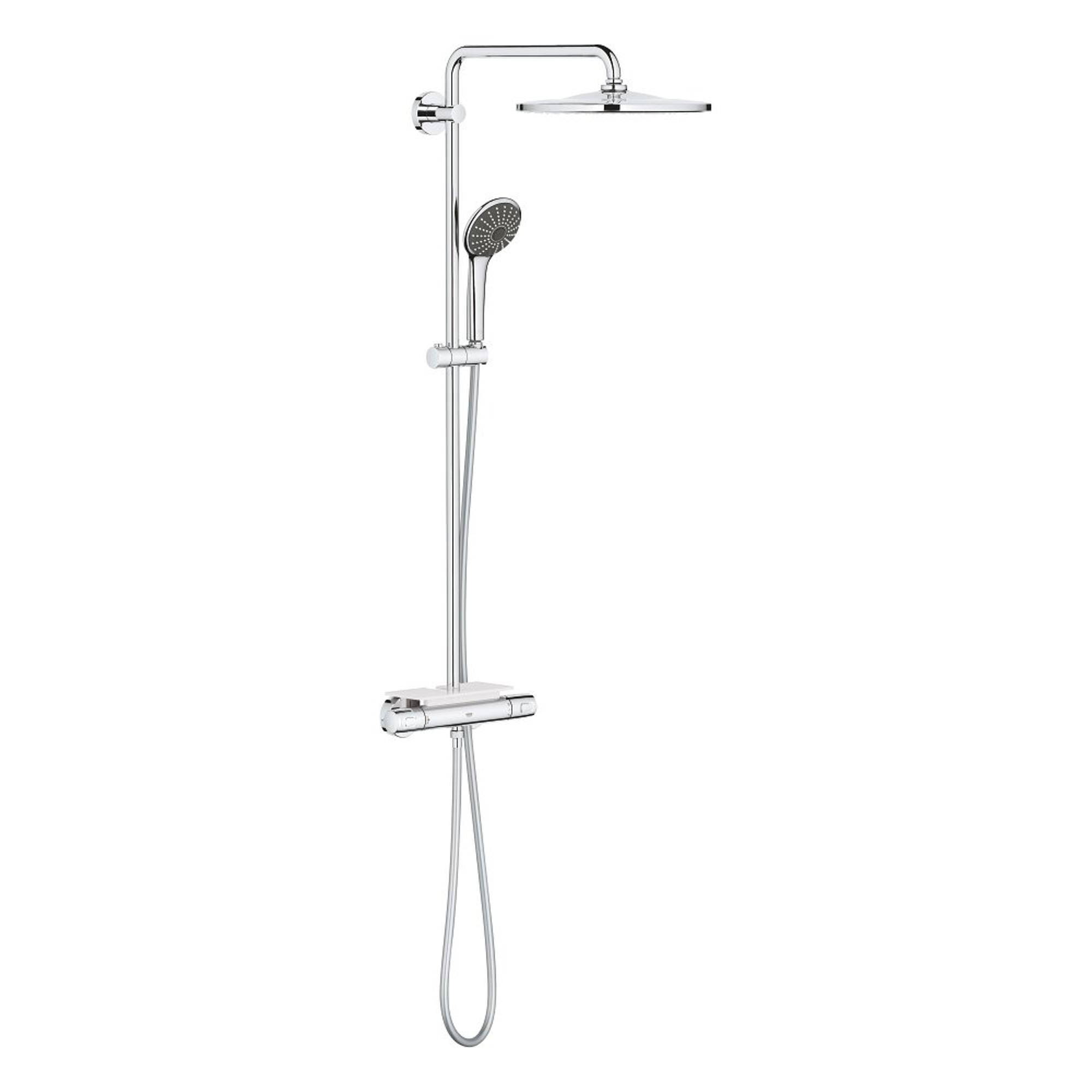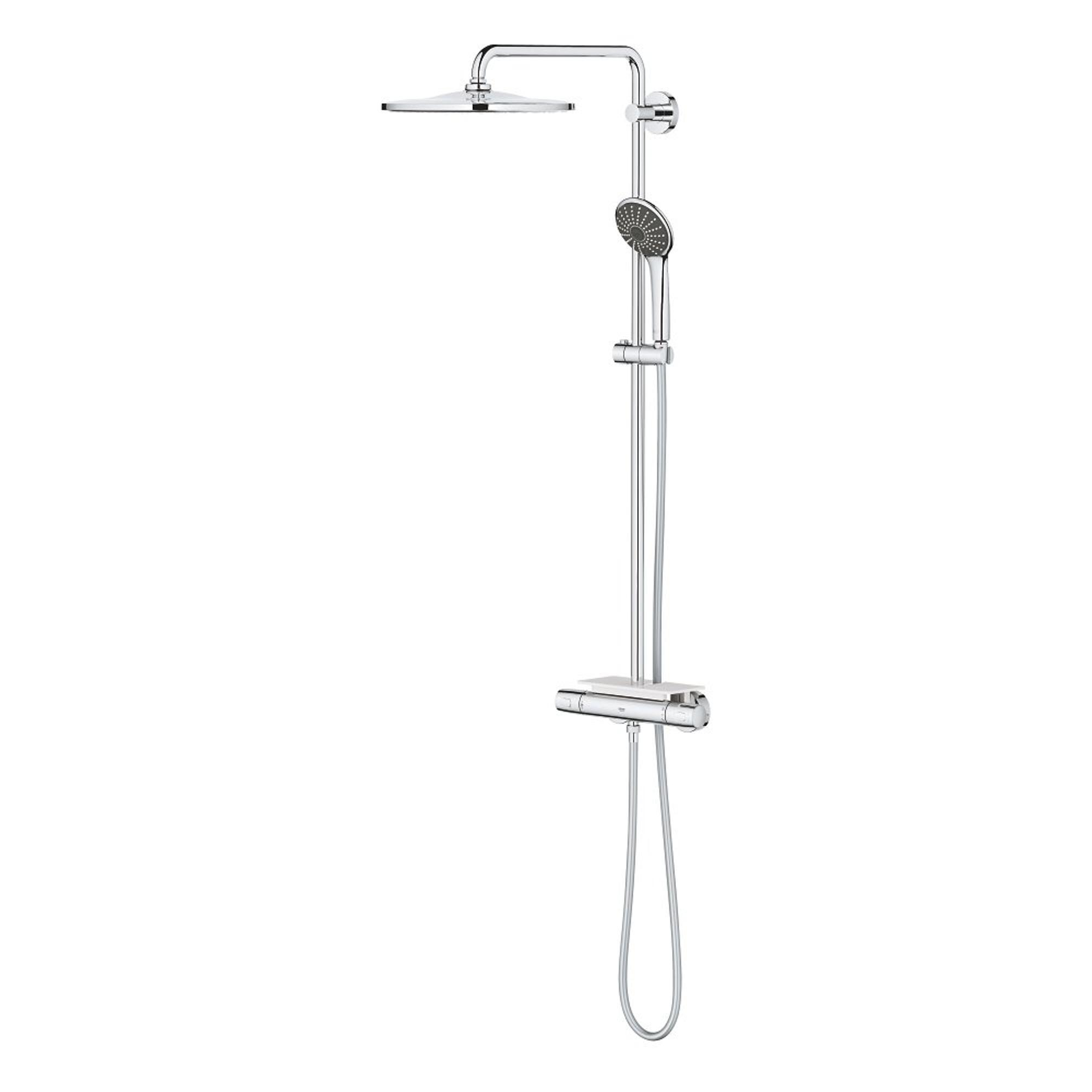 Het Vitalio Joy XXL 310-systeem voegt direct stijl en doucheplezier toe aan moderne badkamers. Dankzij de ergonomische metalen hendels vormt deze een genot om te bedienen en het is ontworpen om zeer eenvoudig te installeren. Dat betekent dat je in een mum van tijd kunt genieten van alle geavanceerde GROHE-technologie die dit systeem bevat. Nauwkeurige bediening is intuïtief met de GROHE MetalGrip-grepen - de bediening is makkelijk zelfs als je gladde handen hebt. Stel je favoriete temperatuur in op de Precision Joy-thermostaat en met GROHE TurboStat blijft het water precies zoals jij het wilt, zelfs als de watertoevoer fluctueert. Veiligheid is ook gegarandeerd, want 100% GROHE CoolTouch betekent dat de hele thermostaatbehuizing nooit te heet wordt, dus er is geen risico op brandwonden. De gebruiksvriendelijke GROHE SafeStop-functie beperkt de watertemperatuur tot maximaal 38˚C – waardoor deze ideaal is voor gezinnen met kinderen - maar de temperatuur kan voor volwassenen worden verhoogd door de hendel met de knop te ontgrendelen. En de optionele GROHE SafeStop Plus temperatuurbegrenzer kan voor extra veiligheid worden ingesteld op 43° C. Met de AquaDimmer van de Precision Joy-thermostaat kan je moeiteloos het watervolume regelen en tegelijkertijd schakelen tussen de hoofd- en handdouche. GROHE DreamSpray zorgt ervoor dat het water uit elk sproeigaatje van de hoofd- en handdouche gelijkmatig stroomt. En de siliconen SpeedClean-sproeigaatjes zijn gemakkelijk vuil- en kalkvrij te houden. De royale 310mm Vitalio Rain Mono hoofddouche heeft een 450mm zwenkarm zodat je de perfecte hoek kunt instellen voor de rustgevende Rain Spray. De Vitalio Joy 110mm Massage-handdouche, die wordt geleverd met een 1750mm Twistfree VitalioFlex Silver-doucheslang en glij-element, heeft drie geweldige straalsoorten: de klassieke Rain Spray, de krachtigere Massage Spray en de milieuvriendelijke SmartRain Spray. En voor beide douches beperkt GROHE WaterSaving technologie de waterstroom tot 9,5 l/min, terwijl je qua kwaliteit niet inlevert. De douche levert namelijk toch pure en bevredigende verwennerij. De meerlaagse coating van krasbestendig GROHE Long-Life chroom heeft een sprankeling die jarenlang meegaat. En dankzij GROHE FastFixation kan het eenvoudig worden geïnstalleerd met behulp van bestaande boorgaten, aangezien de bovenste beugel verstelbaar is. Het wordt ook geleverd met een handige GROHE EasyReach tray, een geweldige plek om douchegels en shampoos binnen handbereik op te bergen. Het GROHE Vitalio Joy XXL 310 douchesysteem - een triomf van vorm en functie die zorgt voor totale douchetevredenheid! bestaat uit:
