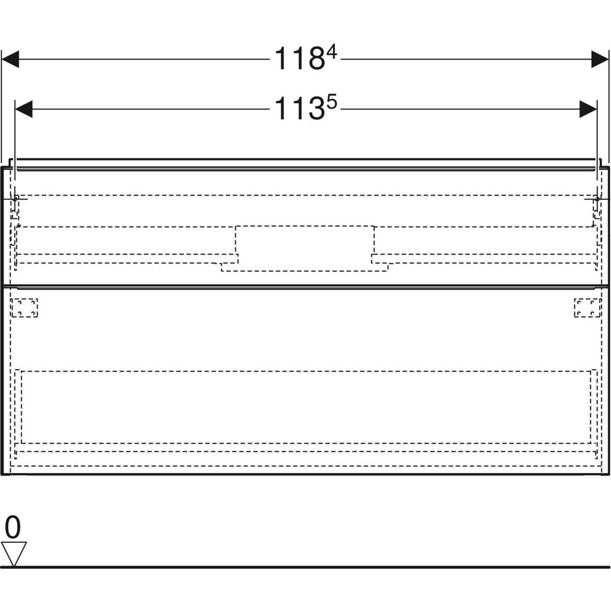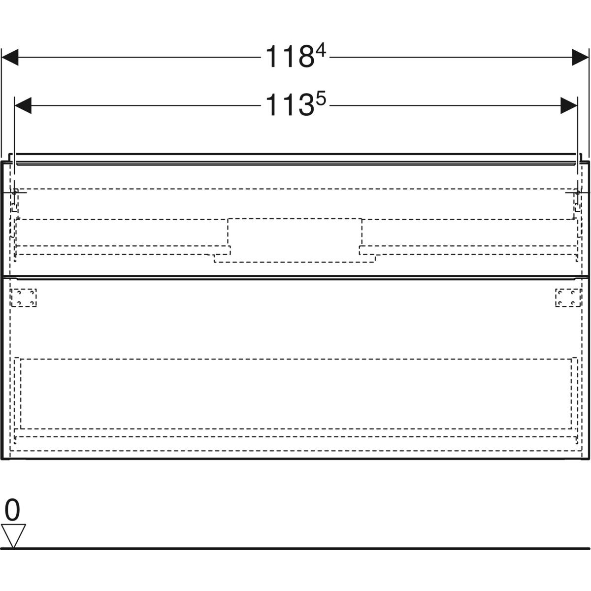 De wastafel onderkast is 118,4cm breed, 61,5cm hoog en 47,6cm diep.