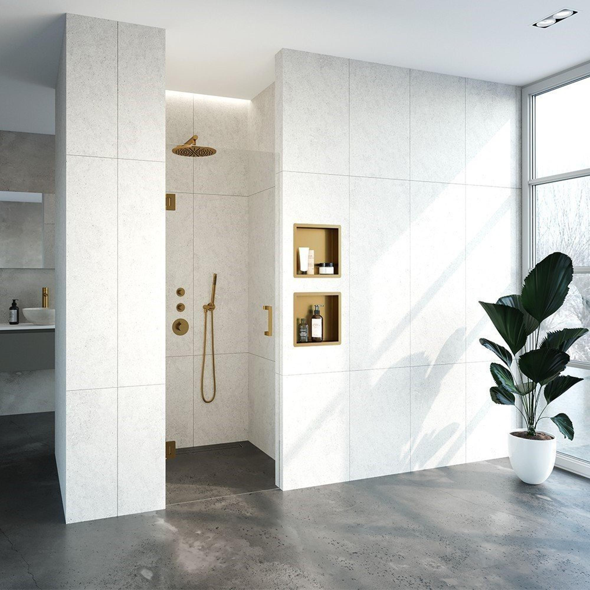 De Saniclass Create Nisdeur straalt luxe uit in elke badkamer. Het profielloze design en de goud geborstelde afwerking geven een exclusieve uitstraling aan de ruimte. Het 8mm veiligheidsglas zorgt niet alleen voor een elegante look, maar ook voor een veilige en duurzame oplossing. Met deze nisdeur voeg je een vleugje glamour toe aan je badkamer, waardoor het een plek van ontspanning en comfort wordt.