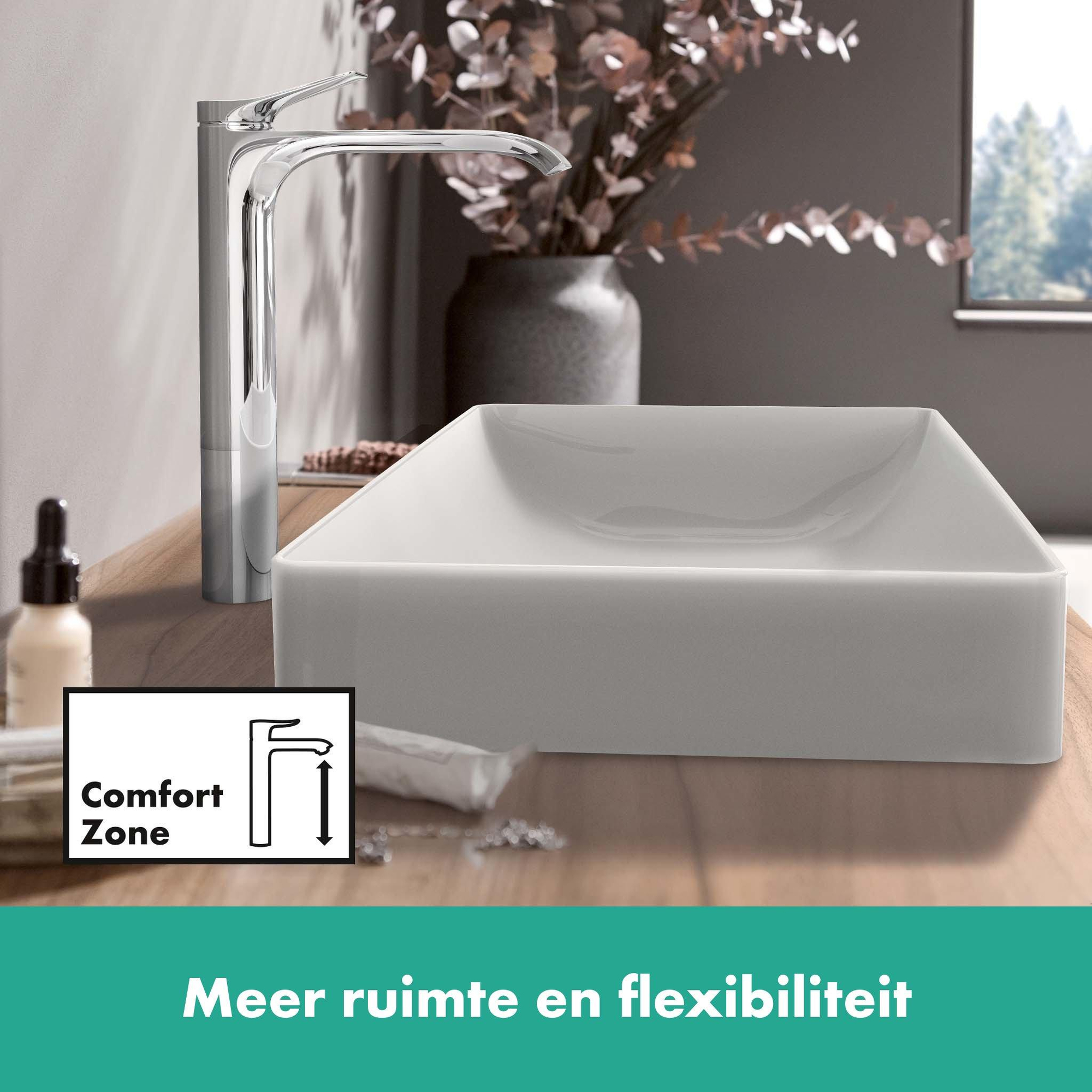 Met de ééngreeps wastafelmengkraan Vivenis 250 met pop-up afvoergarnituur wordt de tijd die u aan de wastafel doorbrengt een welzijnsritueel. De zachte waterstraal stroomt als een kleine waterval uit de extra brede uitloop en schept een gloednieuwe waterbeleving (WaterfallStream). Spoel uw handen en gezicht over de volledige breedte met zijdezachte, met lucht verrijkte druppels. De lange uitloop biedt meer bewegingsvrijheid: Daarom is de kraan ideaal voor vrijstaande opbouw wastafels, omdat ze veel ruimte en een groot gebruiksgemak bieden (ComfortZone 250). Het elegante, gebogen ontwerp van de kraan en het uitmuntende bewezen vakmanschap van hansgrohe. maken van uw badkamer een prettige en ontspannende ruimte.