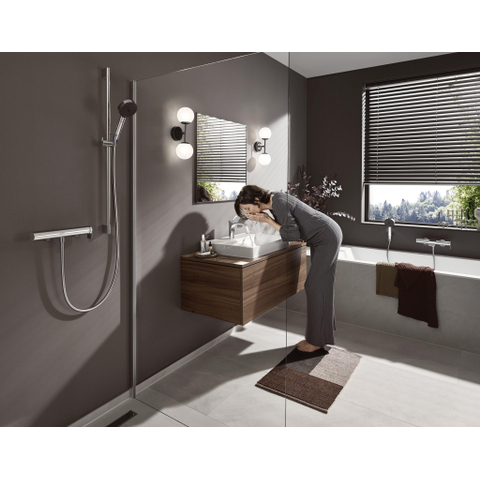 Het watervolume en de temperatuur kunnen eenvoudig en handig worden aangepast met de zijgreep, die is uitgerust met een indrukwekkend, sober, ergonomisch design. Schakel met één druk op de knop over van de baduitloop naar de douchekop: druk gewoon op de Select-knop aan de zijkant. De kraan schakelt zodra het water is uitgezet automatisch terug naar de baduitloop. Grootste voordeel: de hoogwaardige verchroomde finish is eenvoudig te reinigen en blijft langdurig schoon.