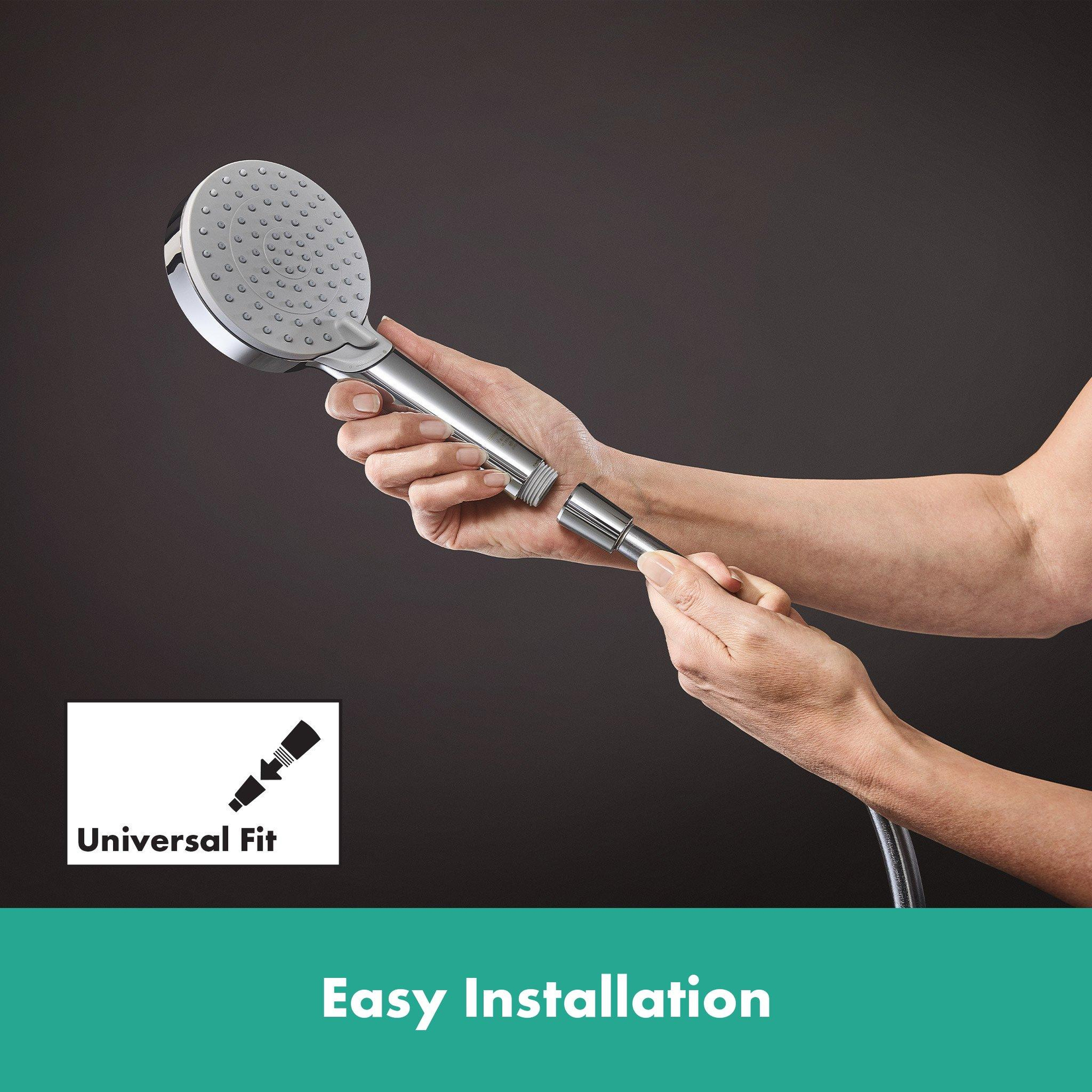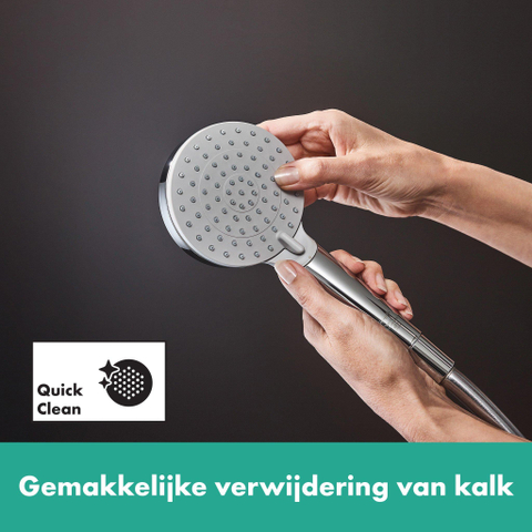 De gemakkelijke manier om te wisselen van straalsoort voor variatie onder de douche. Om te wisselen tussen volledige Rain straal en de krachtige en geconcentreerde IntenseRain straal hoef je alleen aan de straalplaat te draaien. En hansgrohe QuickClean maakt schoonmaken eenvoudig zodat je meer tijd overhoudt om lekker te douchen. Kalk is eenvoudig van de siliconen noppen af te vegen.