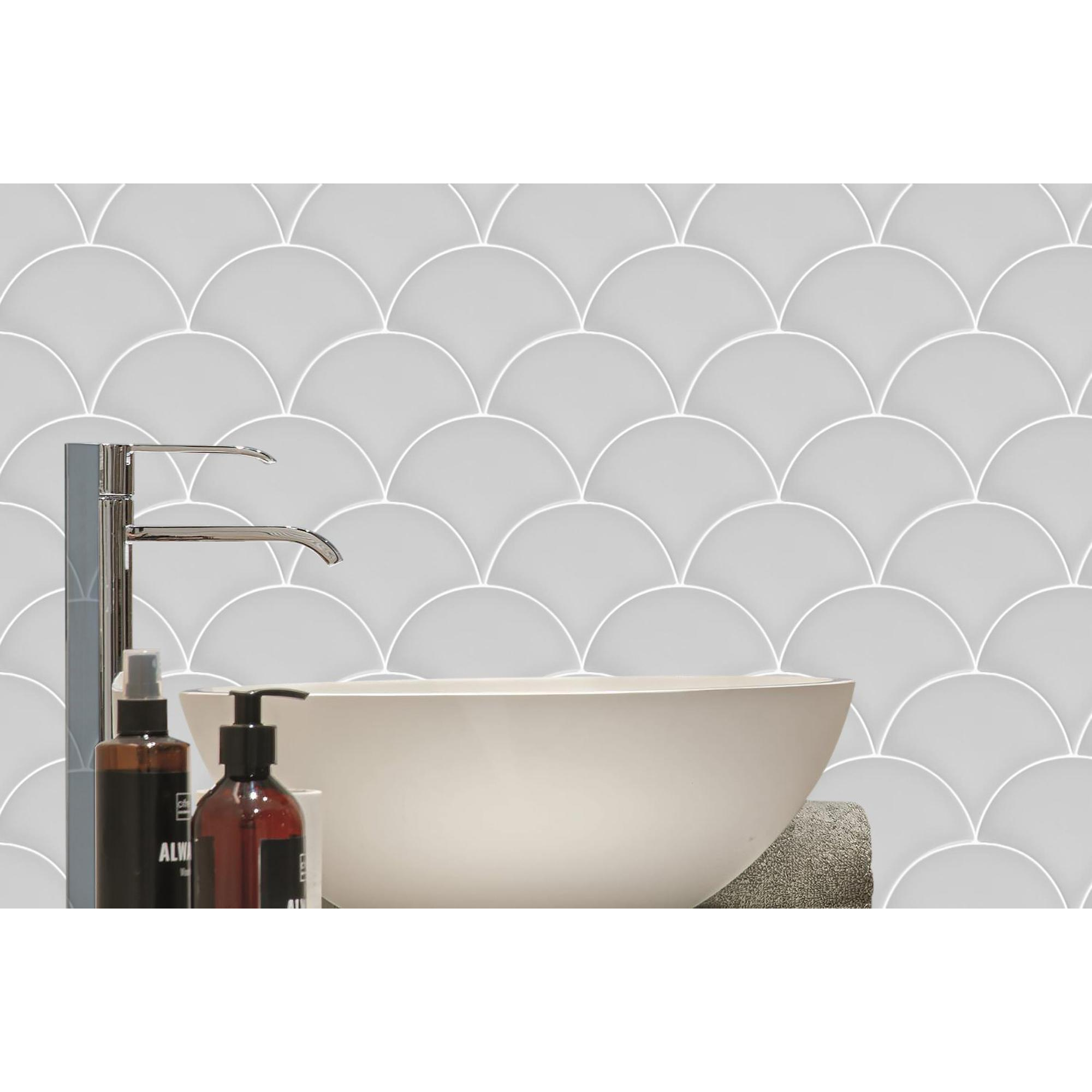 De By Goof Escama wandtegel straalt stijl uit dankzij het unieke Visschub design. Het visgraatpatroon creëert een speels en elegant effect op de wanden. De glanzende witte afwerking zorgt voor een frisse en moderne uitstraling die de ruimte direct transformeert. Of je nu een accentmuur wilt creëren of de hele ruimte wilt betegelen, deze tegel voegt een vleugje klasse toe aan elke omgeving.