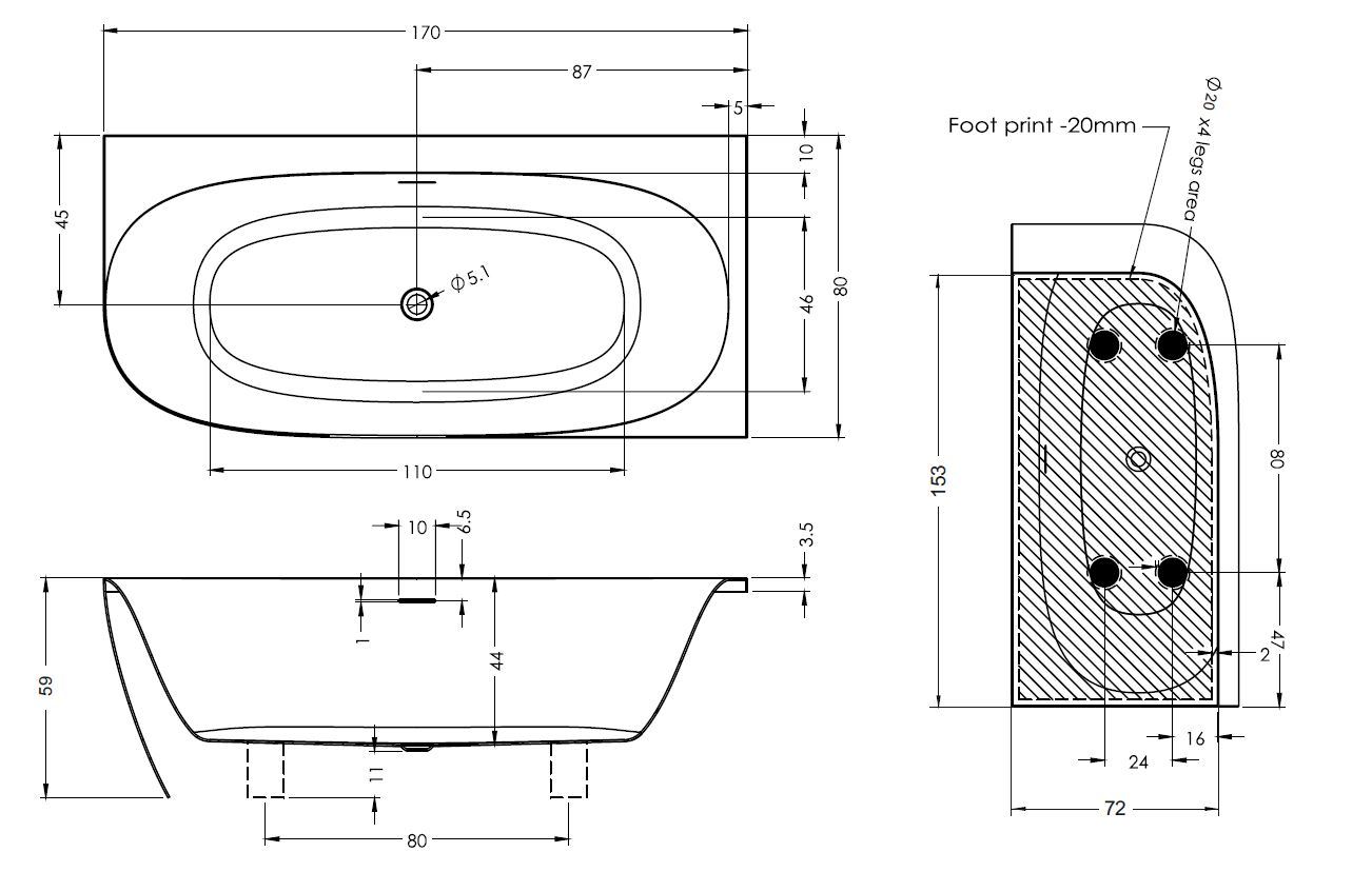 Zeza Cheb Half vrijstaand hoekbad - rechts - 170x80cm -incl poten - sifon - acryl - Glans wit