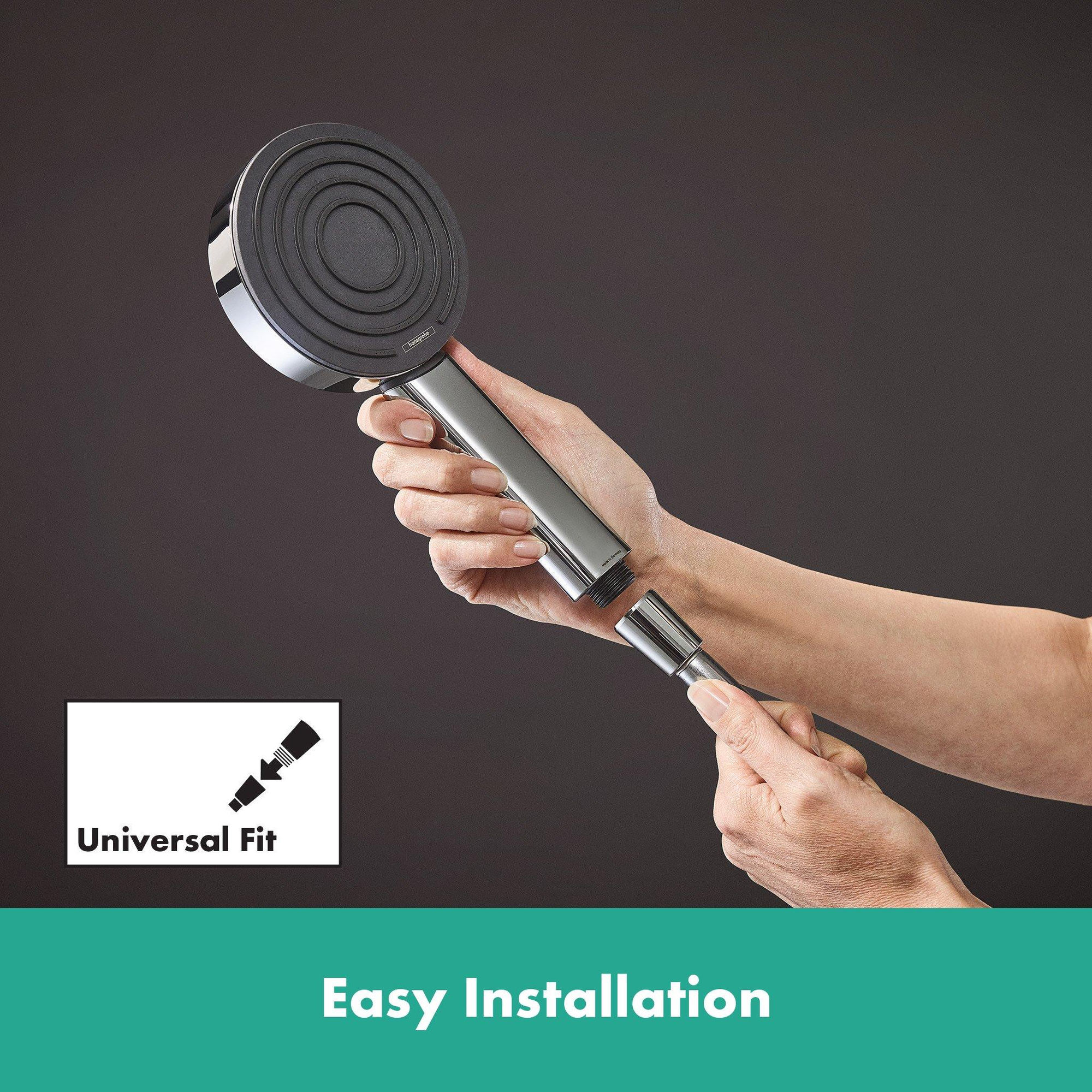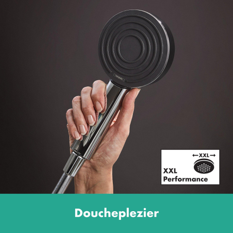 De ergonomische greep voelt comfortabel aan. Dankzij de interne watervoering wordt de buitenkant niet heet, zelfs niet tijdens lange douchebeurten. Een uitspoelbare zeef zorgt voor betrouwbare functionaliteit op de lange termijn: Hij vangt het vuil op voor het in de douchekop kan komen. En na je douche kan kalk eenvoudig van de siliconen noppen op de douchekop worden geveegd (QuickClean).