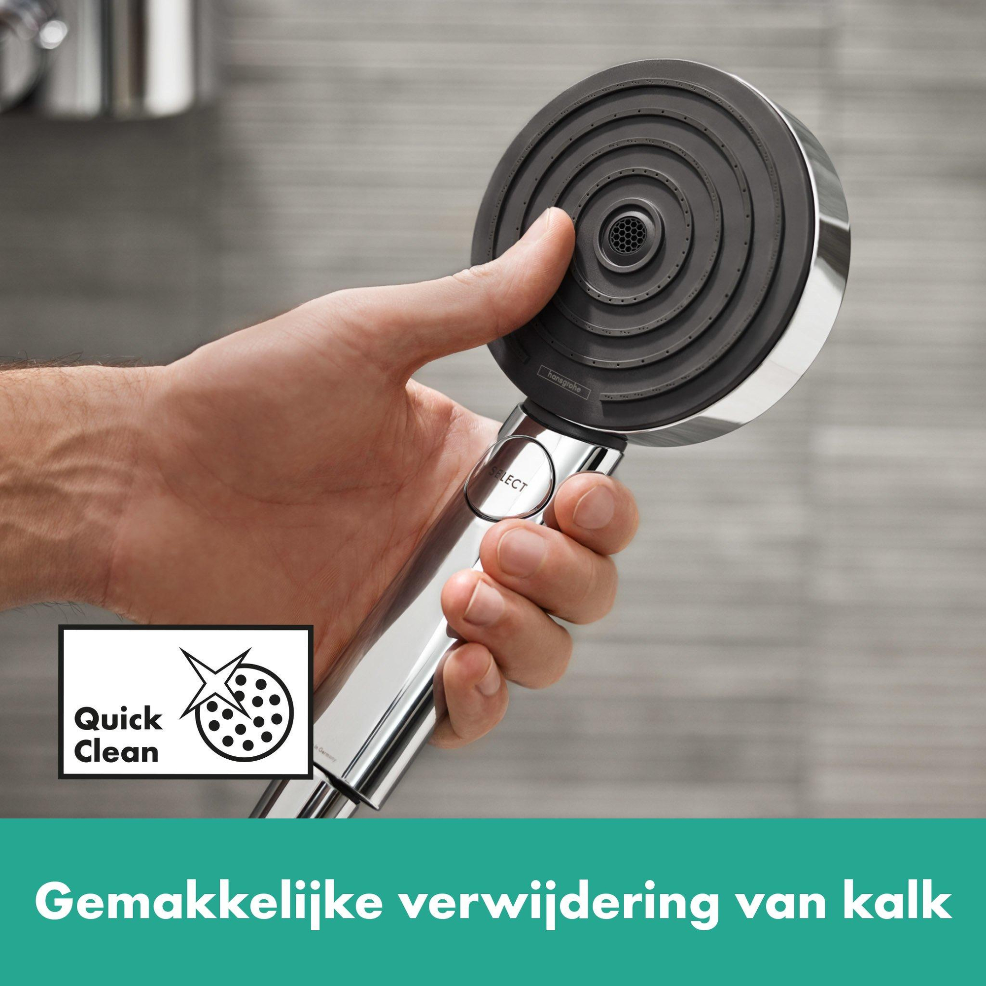De ergonomische greep voelt comfortabel aan. Dankzij de interne watervoering wordt de buitenkant niet heet, zelfs niet tijdens lange douchebeurten. Een uitspoelbare zeef zorgt voor betrouwbare functionaliteit op de lange termijn: Hij vangt het vuil op voor het in de douchekop kan komen. En na je douche kan kalk eenvoudig van de siliconen noppen op de douchekop worden geveegd (QuickClean).