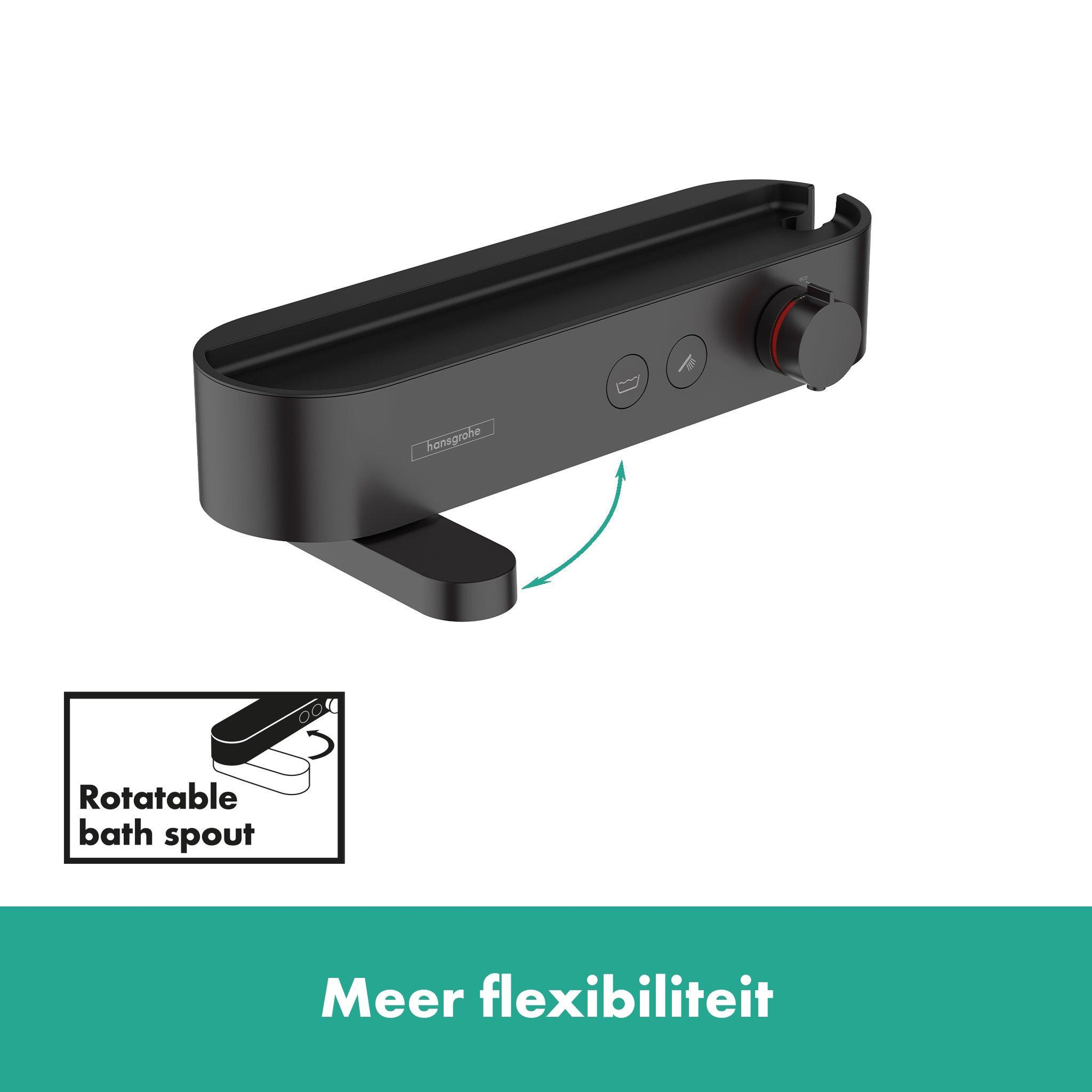 De ShowerTablet Select 400 mat zwart badthermostaat (opbouwmontage) van hansgrohe geeft u meer ruimte bij het bad, met een modern design en slimme functies - voor een nette badkamer waarin u zich goed voelt. De 400 mm brede thermostaatkraan met afgeronde hoeken fungeert als een ruim planchet voor uw persoonlijke verzorgingsproducten. De platte baduitloop aan de onderzijde is makkelijk op te vouwen als deze niet in gebruik is. Hierdoor is de wandgemonteerde thermostaatkraan een ruimtebesparend wonder. Een douchekop is altijd gemakkelijk bereikbaar in de aan de zijkant geïntegreerde houder.