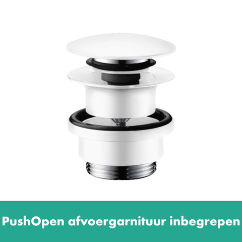 De PushOpen afvoergarnituur wordt ook meegeleverd en kan zonder trekstang worden bediend. Druk kort met de vinger op de afvoerstop en de klep gaat open of dicht. De kraan oogt nog puristischer zonder de trekstang aan de achterzijde.