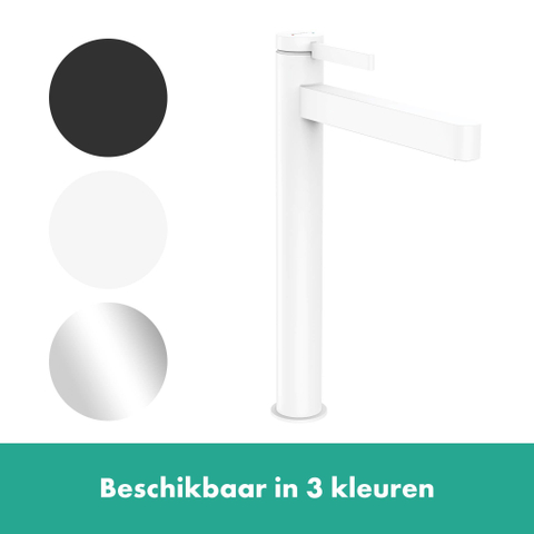 De Finoris 260 ééngreeps mengkraan in mat wit met PushOpen afvoergarnituur van hansgrohe valt echt op met zijn slanke, geometrische vorm en lange vleugelgreep. Het elegante ontwerp past bijzonder goed bij een opbouwwastafel en maakt een expressief statement met de makkelijk te reinigen, mat witte finish. De hoge uitloop, op een afstand van ca. 26 cm van de wastafel, vereenvoudigt vele dagelijkse taken (ComfortZone 260). Of u nu grote emmers vult of gewoon snel uw haar wast onder de kraan, de Finoris 260 ééngreeps mengkraan biedt u superieure ondersteuning.