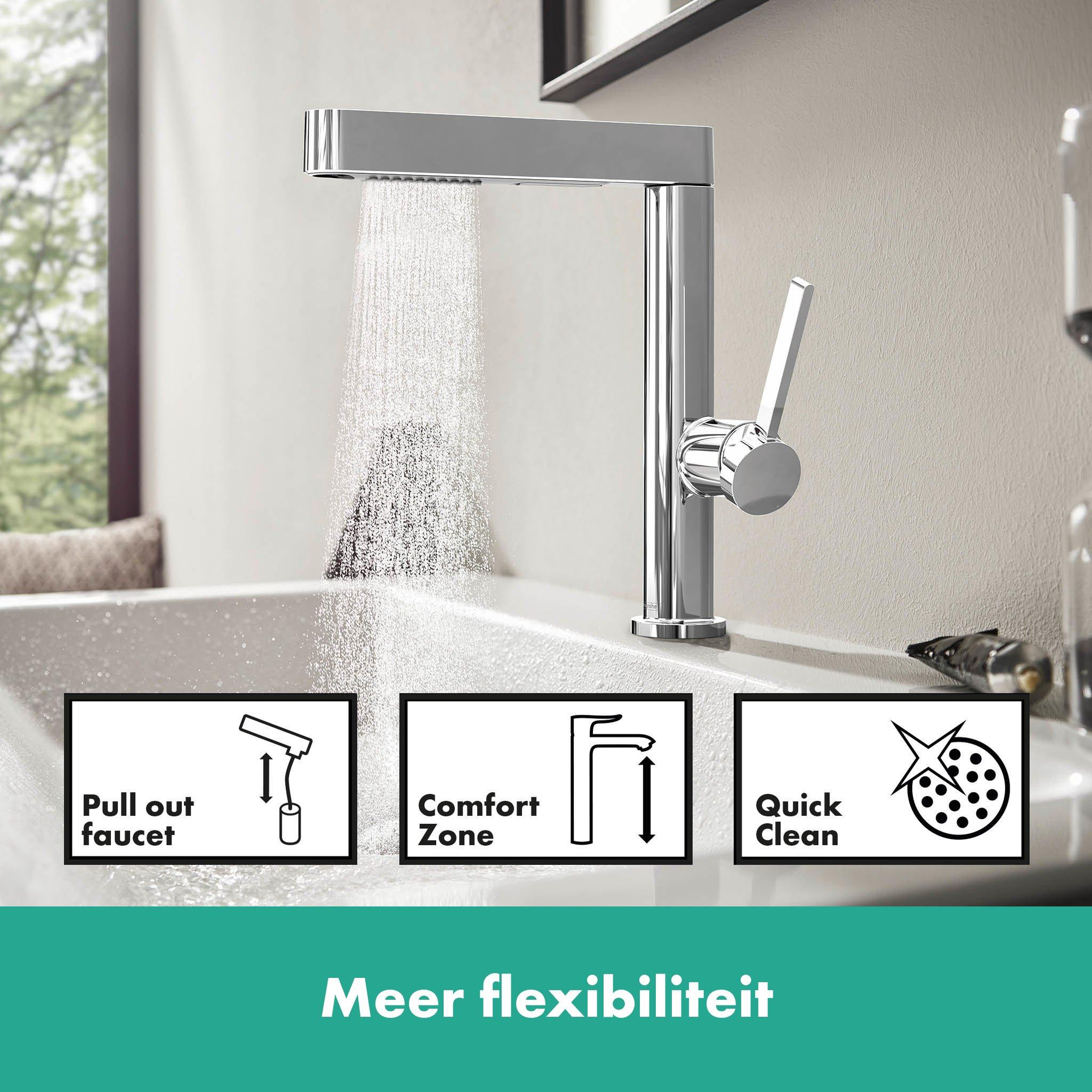 De Finoris 230 ééngreeps wastafelmengkraan met uittrekbare vuistdouche van hansgrohe maakt een inspirerende statement met zijn strakke, geometrische design en talrijke handige functies. De wastafel is het hart van de badkamer. Hier is het leven vaak onstuimig en lijken er altijd nieuwe uitdagingen te zijn. Het is dus prettig als de wastafel een echte teamspeler is, die u ondersteunt met revolutionaire ideeën.