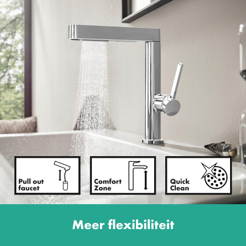 De uitloop kan bijvoorbeeld flexibel worden uitgetrokken tot een lengte van maximaal 0,50 meter. De Select-knop van hansgrohe schakelt met één druk op de knop om van de kristalheldere laminaire straal naar de straalsoort PowderRain. Dit helpt bij snel haren wassen onder de kraan, babybadjes, het uitspoelen van de wastafel, en nog veel meer. Dankzij de ingebouwde terugstelfunctie wordt de laminaire straal na het uitschakelen van de kraan weer automatisch geselecteerd - dus geen onaangename verrassingen meer.