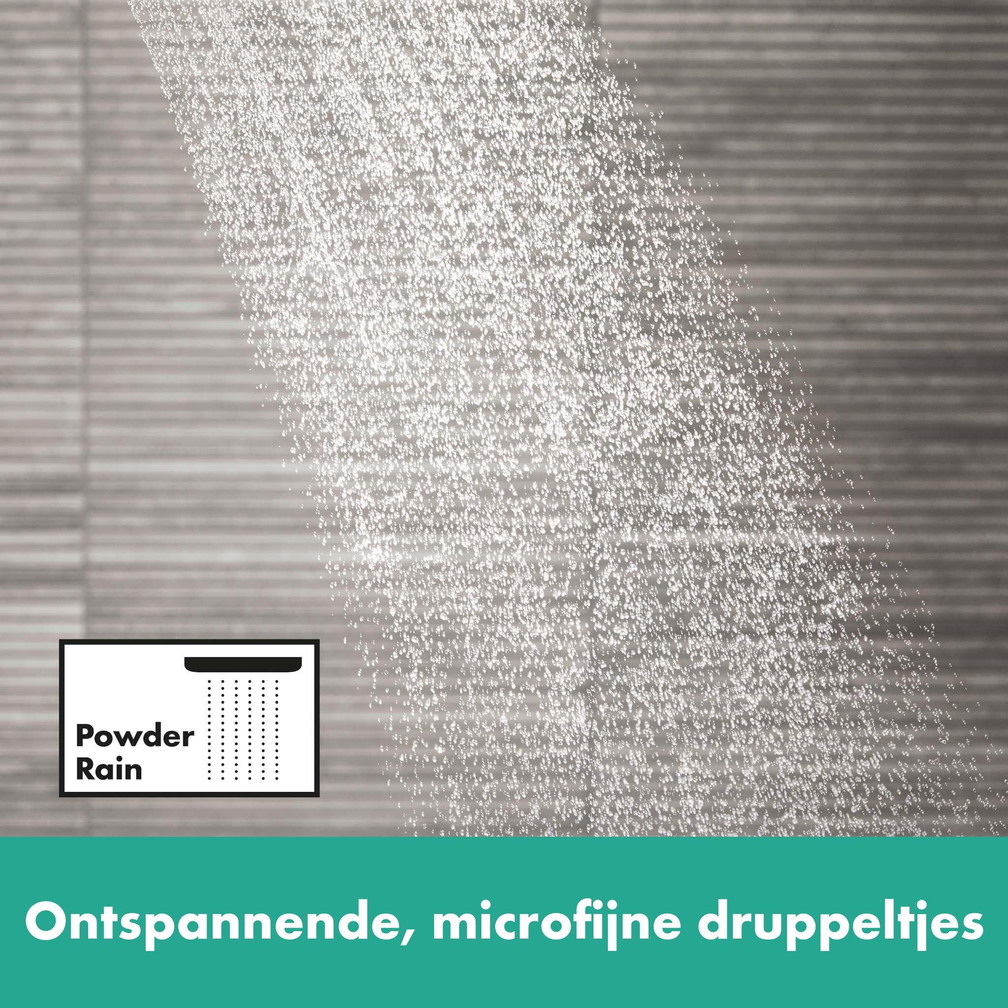 De badset Pulsify 105 in mat zwart met 1,25 m doucheslang van hansgrohe is het perfecte innovatieve en individuele product voor die dagelijkse feel-good douche. Eén blik op het nieuwe type straalplaat in een rijk mat zwart toont: Pulsify richt zich duidelijk op mensen. De ringvormige straalopeningen die rond de 105 mm douchekop cirkelen, doen denken aan de zachte bewegingen van water. De hansgrohe PowderRain-sproeier hult uw lichaam zachtjes in een cocon van de fijnste waterdruppels. Het tijdloze, ronde design en de moderne mat zwarte finish maken van Pulsify een echt statement met individuele aantrekkingskracht voor elke badkamer.