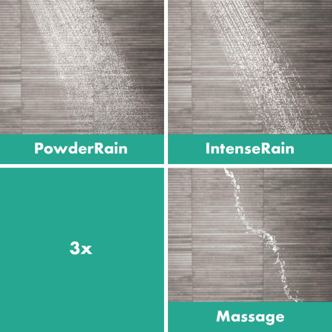 Wissel tussen straalsoorten met een enkele druk op de knop (Select): hansgrohe PowderRain omhult het lichaam zachtjes in een cocon van de fijnste waterdruppels. IntenseRain stimuleert en is perfect voor het uitspoelen van shampoo. En de derde straalsoort is een krachtige massagestraal. Uw douche wordt de plek voor dagelijkse ontspanmomentjes.