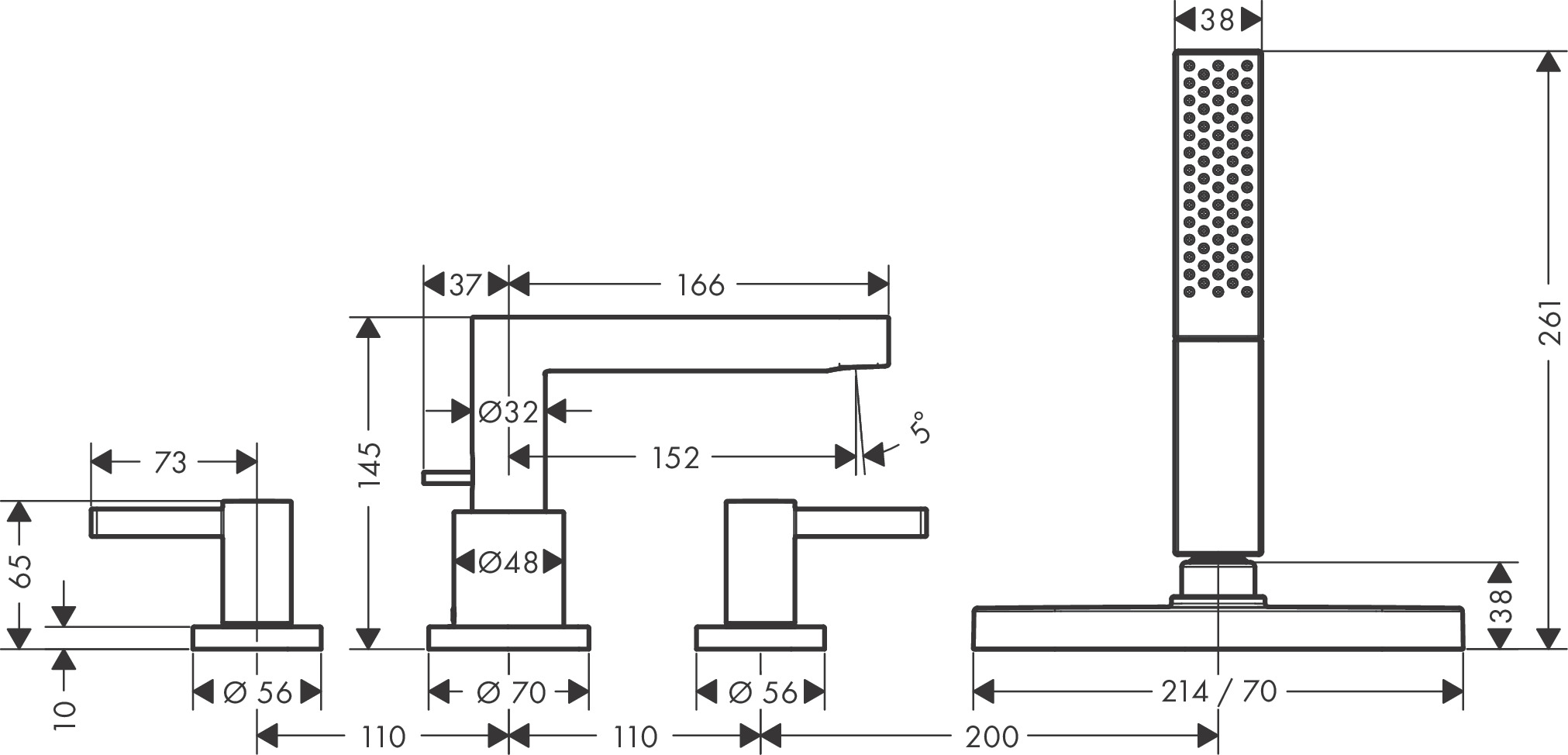 De Finoris 4-gats badrandmengkraan in mat zwart met sBox van hansgrohe staat bol van de innovaties met zijn door en door moderne interpretatie van de klassieke tweegreeps mengkraan. Het precieze geometrische ontwerp ziet er niet alleen indrukwekkend uit, maar biedt ook een duidelijke en eenvoudige bediening. De ergonomische vleugelgrepen regelen het watervolume en de temperatuur via duurzame keramische bovendelen van hansgrohe. De omstelling schakelt met één draai aan de greep om tussen baduitloop en douchekop.