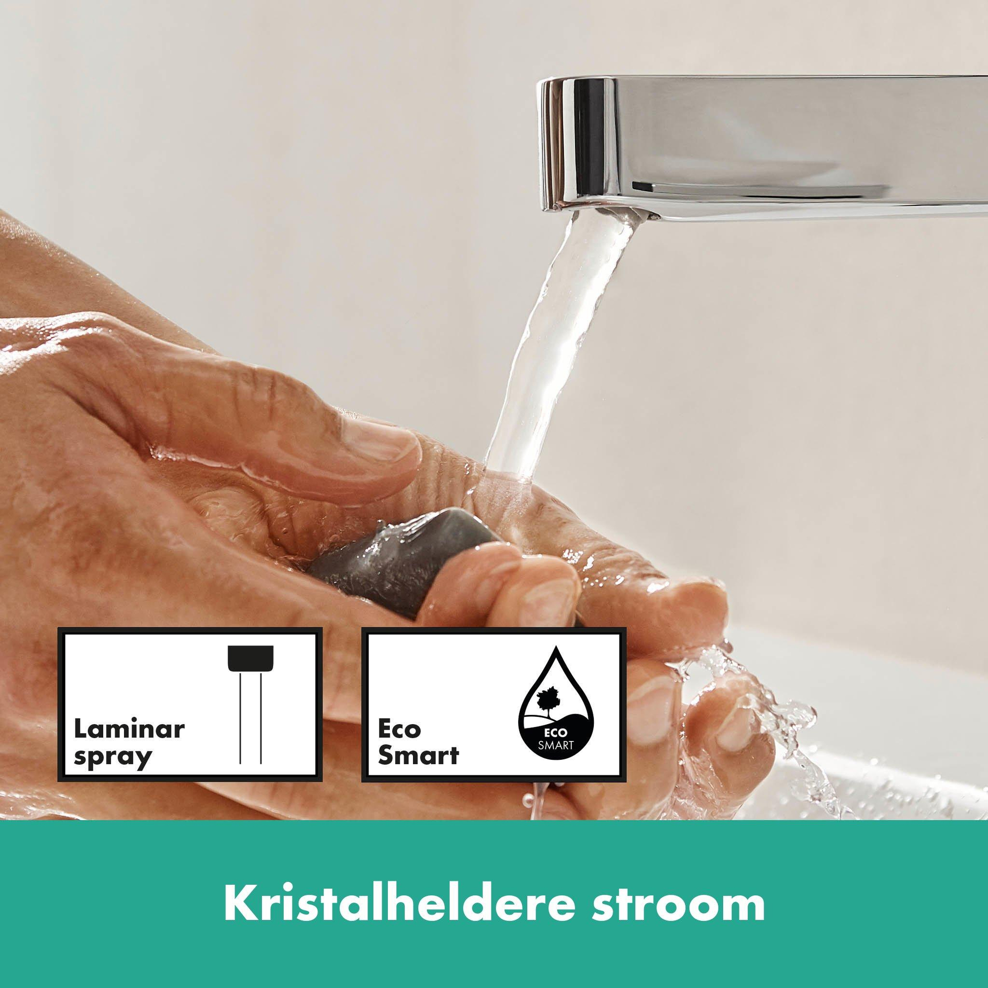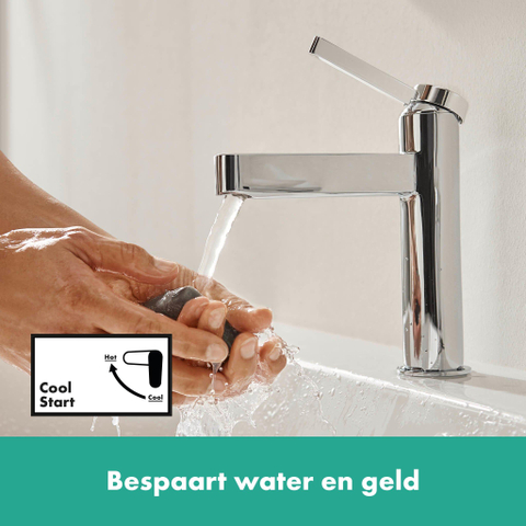 De CoolStart-variant helpt energie te besparen: Als de greep in het midden staat, stroomt er alleen koud water. Pas als hij naar links wordt gedraaid, wordt er heet water toegevoegd. Dankzij de hansgrohe EcoSmart-technologie is de designkraan uiterst waterbesparend. Hij verbruikt maximaal 5 l/min., zelfs bij hoge waterdruk.