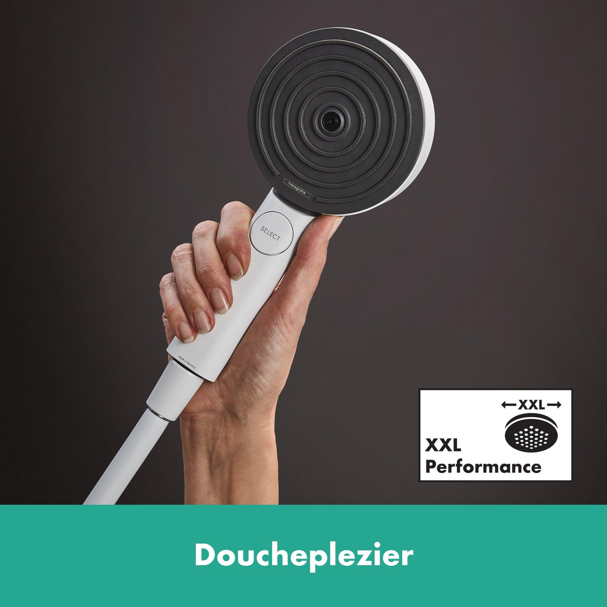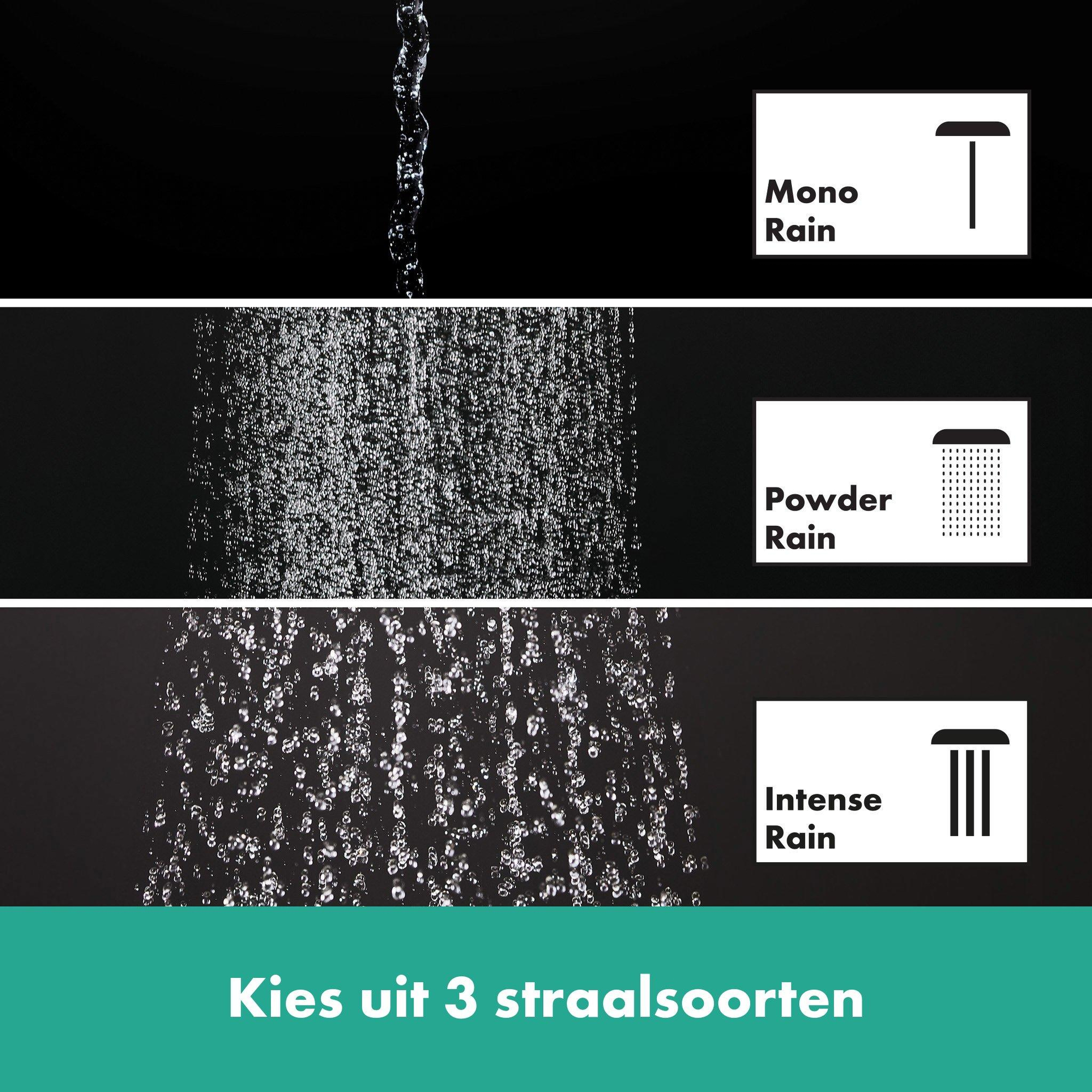 Wissel tussen straalsoorten met een enkele druk op de knop (Select): hansgrohe PowderRain hult het lichaam zachtjes in een cocon van de fijnste waterdruppels. IntenseRain stimuleert en is perfect voor het uitspoelen van shampoo. En de derde straalsoort is een krachtige massagestraal. Uw douche wordt de plek voor dagelijkse ontspanmomentjes.