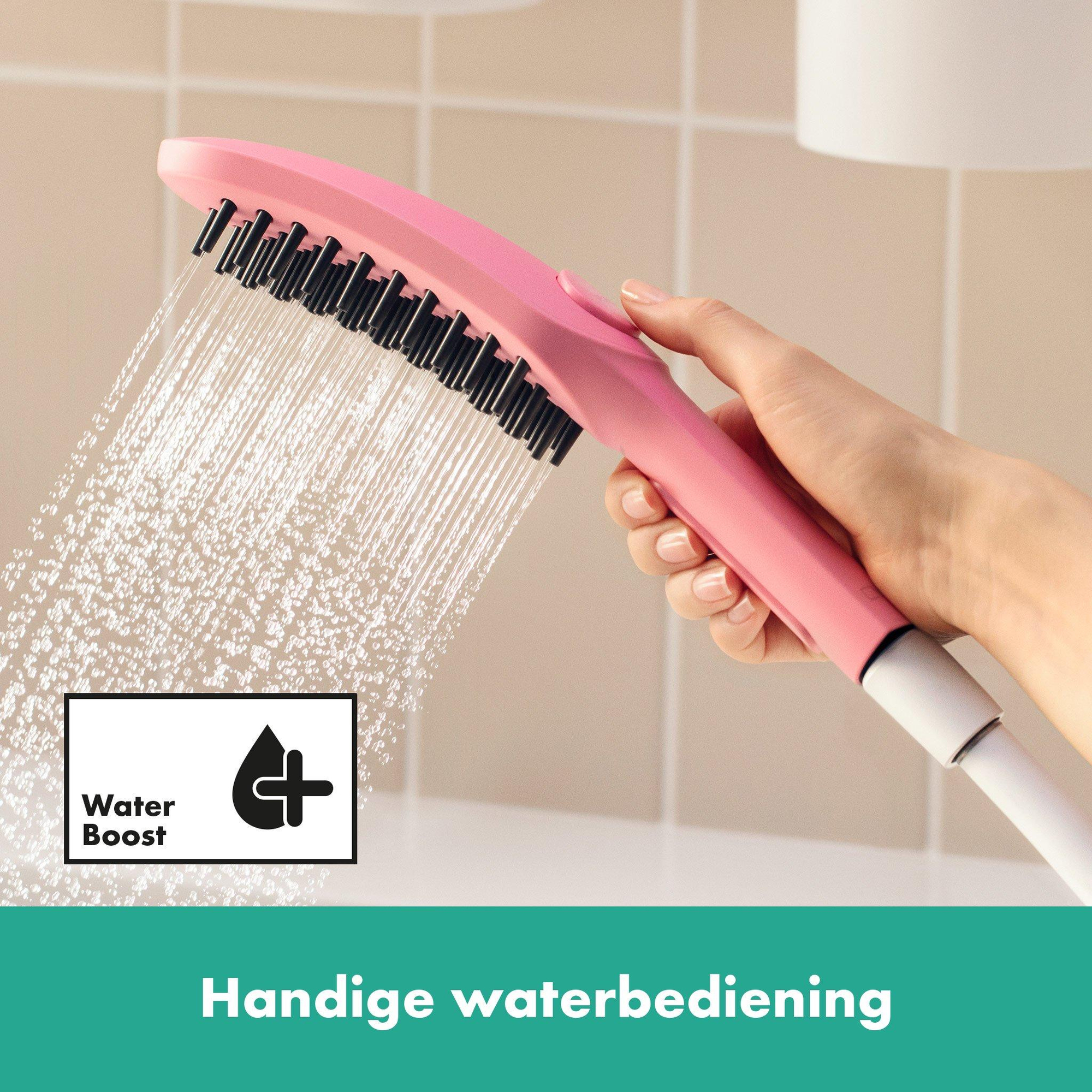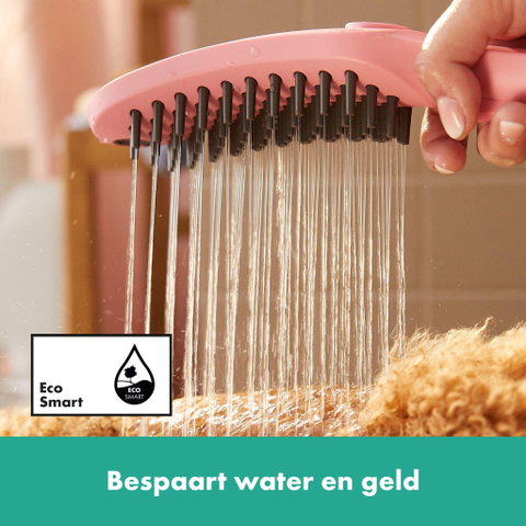Op de kop helpt de gerichte straal de klauwen precies schoon te maken. Het verwijdert vuil tussen de klauwen. De zachte straalopening voor de poten gebruikt het voorste deel van de douche en reinigt efficiënt. De opening voor de vacht is de lengte van de gehele straalplaat. Het is een luxe waterstraal die je harige vriend verwent. De extra lange, flexibele spuitkoppen brengen het water diep in de ondervacht om shampoo effectief en grondig uit te spoelen en kan huidirritaties verminderen. Wissel tussen de stralen met een knop van hansgrohe-technologie