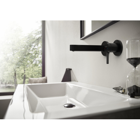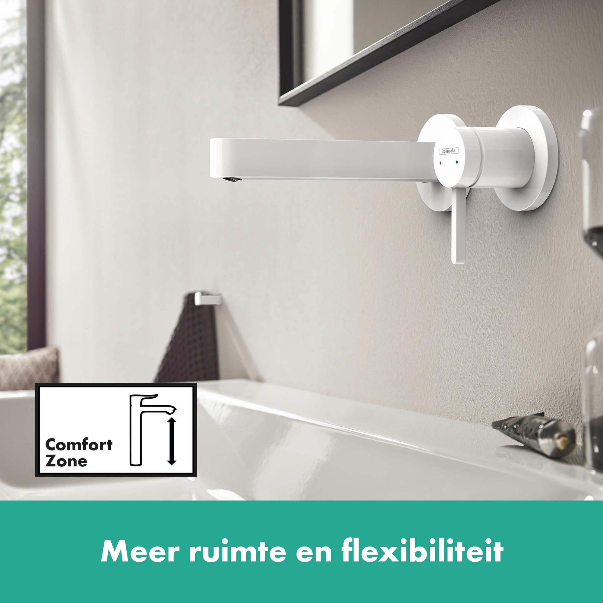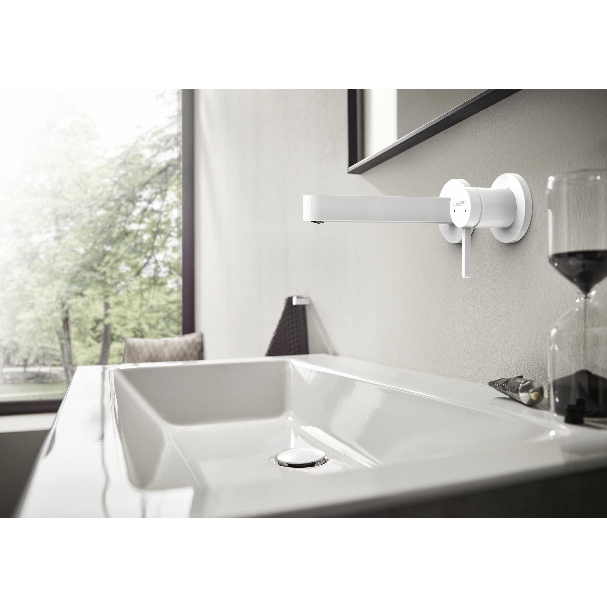 De Finoris 2-gats wastafelkraan in mat wit voor wandmontage (16,5 cm) van hansgrohe maakt een echt statement, dankzij zijn slanke, geometrische vorm en slimme wandmontage. Dit creëert meer ruimte rond de wastafel en is tegelijkertijd goed te combineren met een vrijstaande waskom. Het minimalistische ontwerp maakt een expressief statement in de badkamer met zijn gemakkelijk te reinigen mat witte finish.