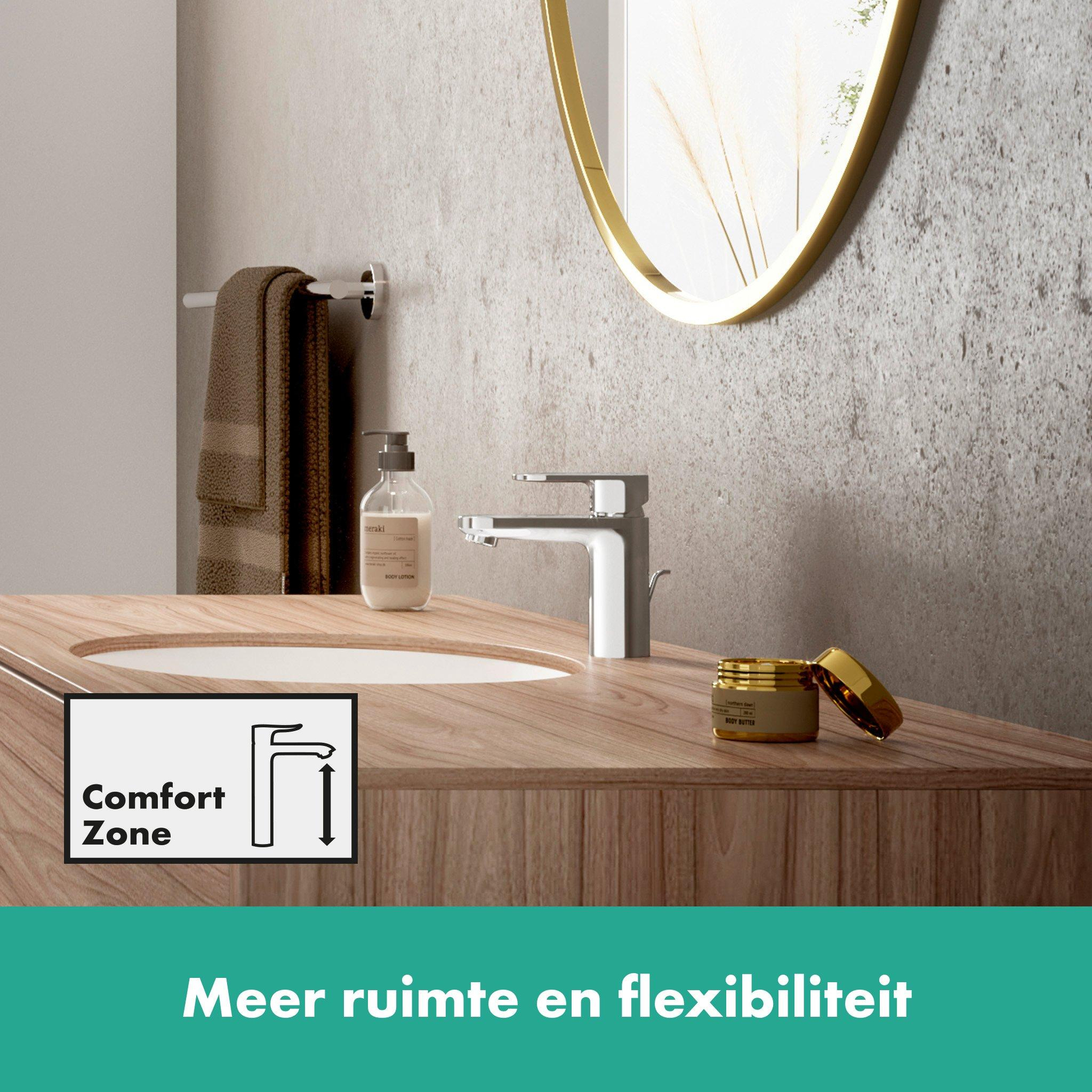 Met de subtiele elegantie en het harmonieuze design is de hansgrohe Vernis Blend ééngreeps wastafelmengkraan 100 met pop-up afvoergarnituur perfect voor elke fontein in de badkamer of het gastentoilet. Super praktisch: De afstand tussen de uitloop en de wastafel zorgen voor genoeg gebruiksruimte (ComfortZone 100). De robuuste metalen pop-up afvoergarnituur wordt meegeleverd en kan makkelijk met één hand geopend en gesloten worden. De Vernis Blend kranen brengen tijdloos design en de bewezen hansgrohe gebruiksvriendelijkheid de badkamer binnen en zijn beschikbaar voor een aantrekkelijke prijs.