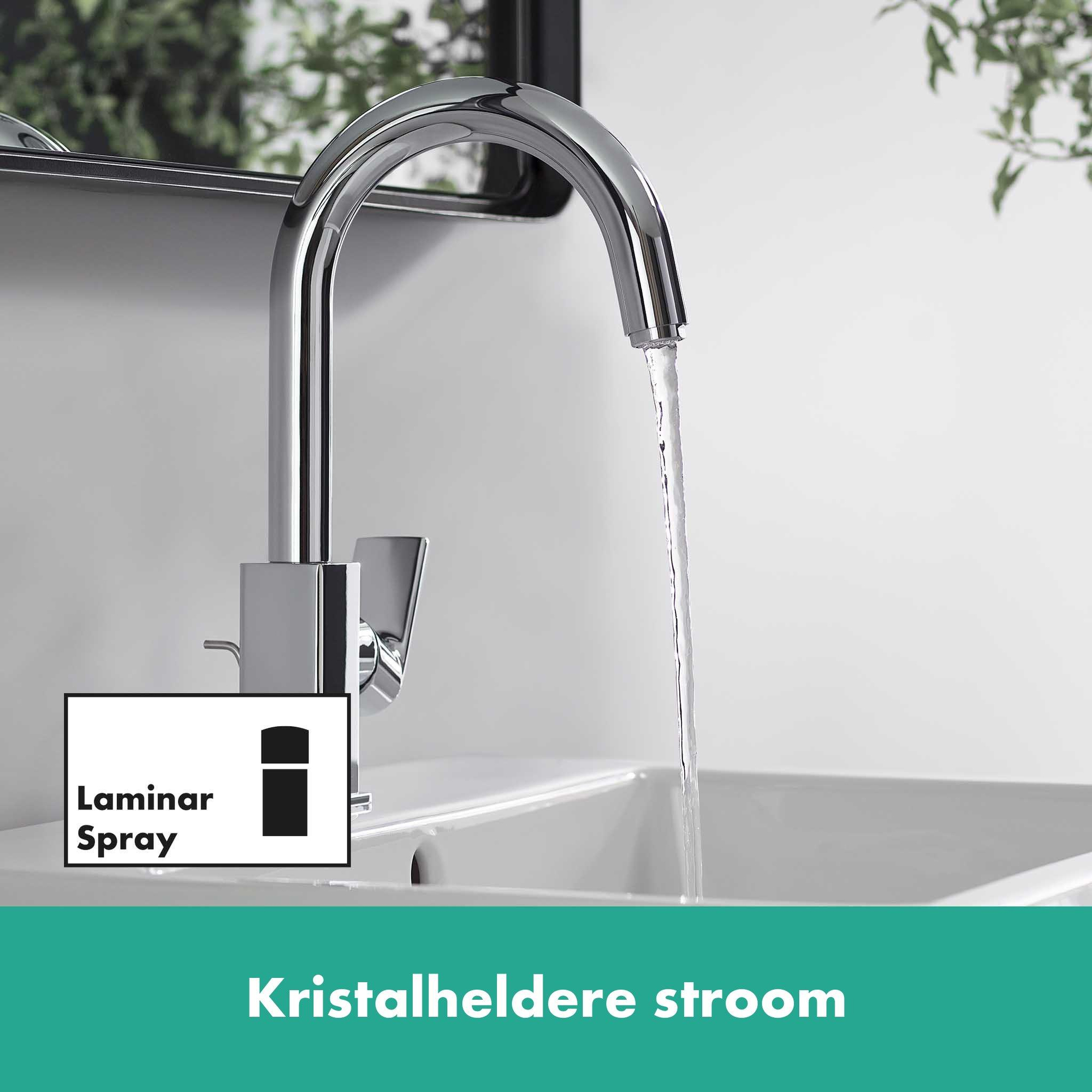 De waterhoeveelheid en temperatuur kunnen ingesteld worden met de gebruiksvriendelijke, ergonomisch gevormde greep die het hoogwaardig hansgrohe keramisch mengsysteem bedient en niet losraakt, ook niet bij veelvuldig gebruik. Nog een pluspunt: Deze kraan bespaart geld en beschermt het milieu omdat de doorstroomhoeveelheid automatisch begrensd is tot 4,3 l/min, zelfs als de waterdruk hoog is (EcoSmart). Het water wordt verrijkt met lucht voor een volle waterstraal en minder gespetter (AirPower).