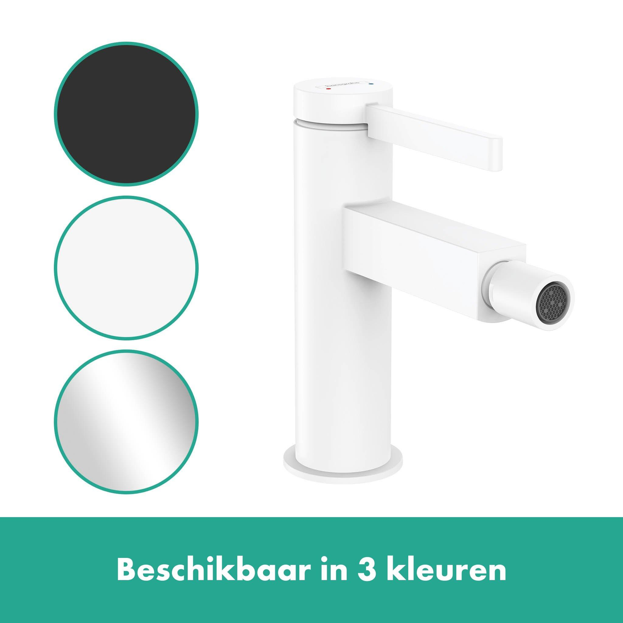De Finoris ééngreeps bidetkraan in mat wit met PushOpen afvoergarnituur van hansgrohe valt echt op met zijn slanke, geometrische vorm en lange vleugelgreep. Het elegante design past bijzonder goed in een puristische badkamersfeer en maakt een expressief statement met de makkelijk te reinigen, mat witte finish. Laat uw persoonlijke stijl tot uitdrukking komen met het kraanassortiment van Finoris.