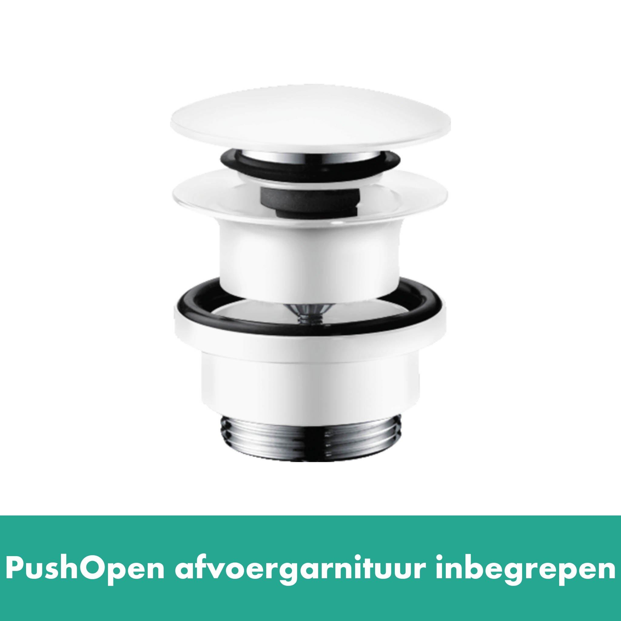 De meegeleverde PushOpen afvoergarnituur kan zonder trekstang worden bediend. Druk kort met de vinger op de afvoerstop en de klep gaat open of dicht. De kraan oogt nog puristischer zonder de trekstang aan de achterzijde.