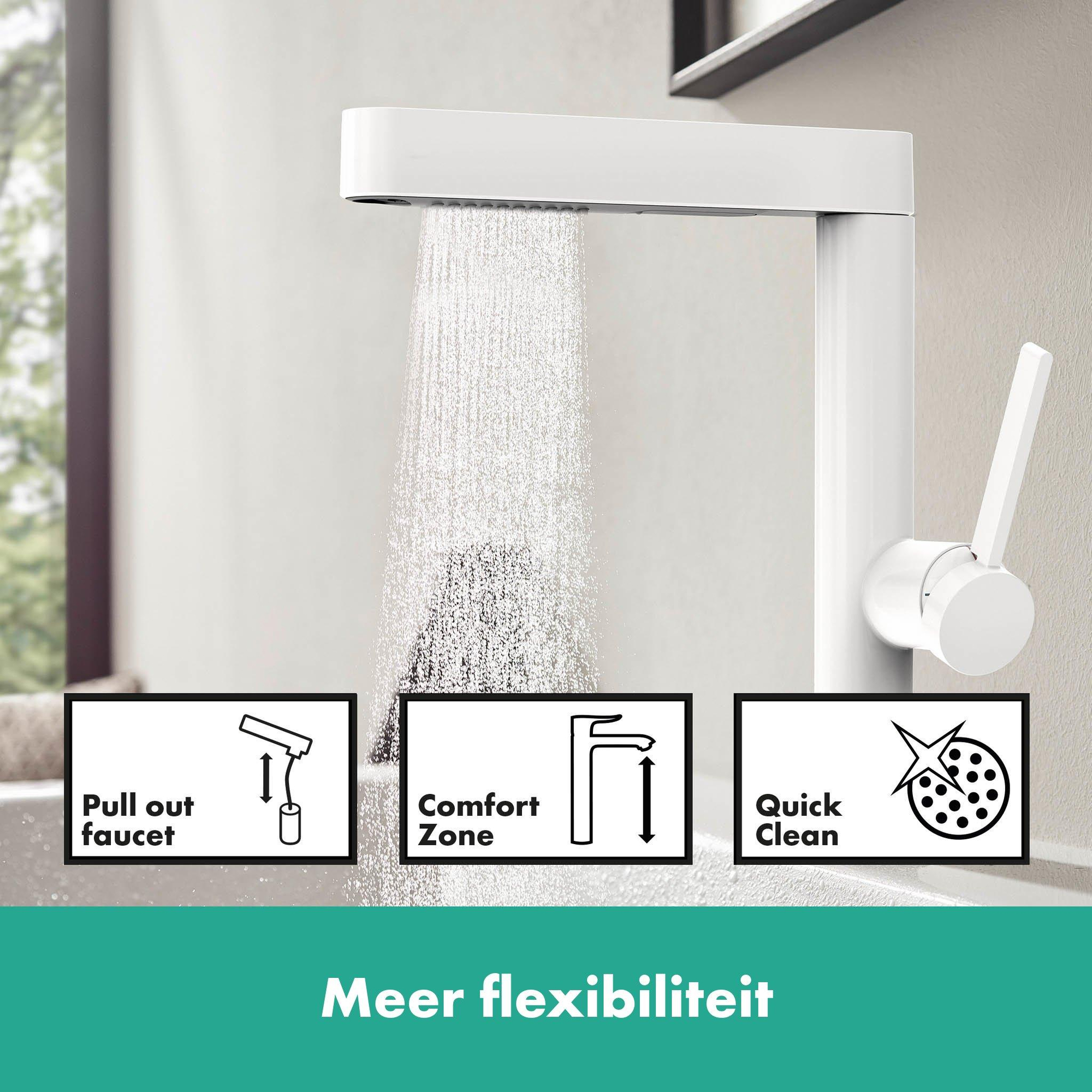 De Finoris 230 ééngreeps wastafelmengkraan in mat wit met uittrekbare vuistdouche van hansgrohe maakt indruk met zijn strakke, geometrische design en talrijke handige functies. De wastafel is het hart van uw badkamer. Het leven is vaak onstuimig in de badkamer en er zijn altijd nieuwe uitdagingen. Het is dus prettig als de wastafel een echte teamspeler is, die u ondersteunt met revolutionaire ideeën.