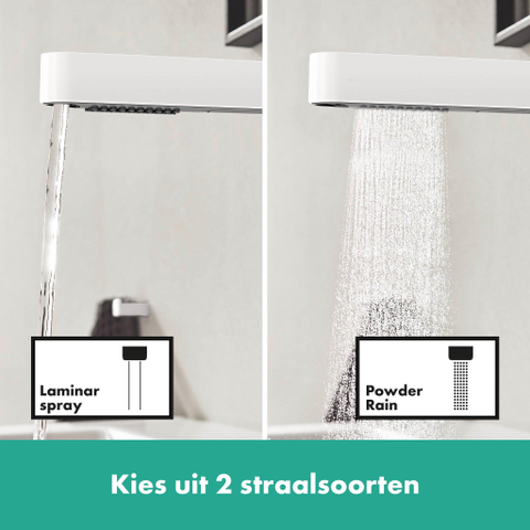 De uitloop kan bijvoorbeeld flexibel worden uitgetrokken tot een lengte van maximaal 0,50 meter. Met de Select-knop van hansgrohe schakelt u met één druk op de knop om van de kristalheldere laminaire straal naar de straalsoort PowderRain. Dit helpt bij snel haren wassen onder de kraan, babybadjes, het uitspoelen van de wastafel, en nog veel meer. Dankzij de ingebouwde terugstelfunctie wordt de laminaire straal na het uitschakelen van de kraan weer automatisch geselecteerd - dus geen onaangename verrassingen meer.