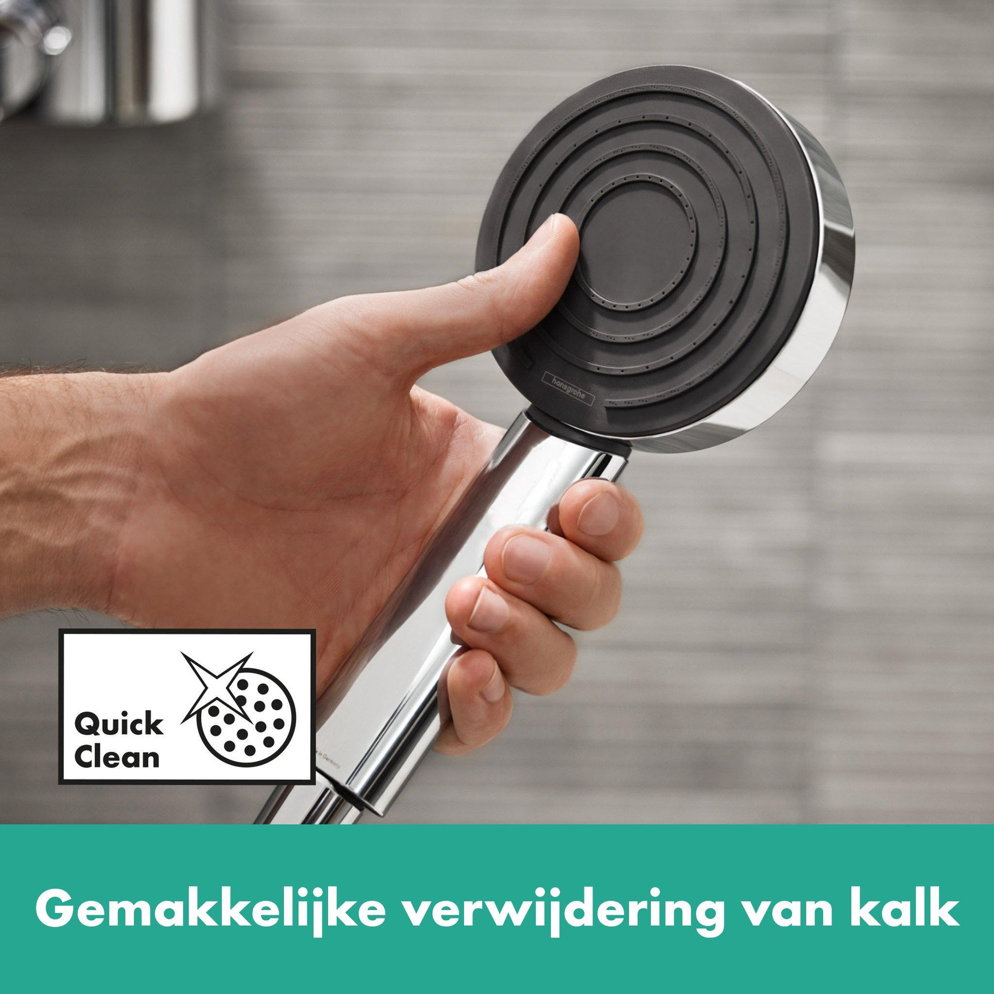 De ergonomische greep voelt comfortabel aan. Dankzij de interne watervoering wordt de buitenkant niet heet, zelfs niet tijdens lange douchebeurten. Een uitspoelbare zeef zorgt voor betrouwbare functionaliteit op de lange termijn: Hij vangt het vuil op voor het in de douchekop kan komen. En na het douchen kan kalk gemakkelijk van de siliconen noppen op de douchekop worden geveegd (QuickClean).