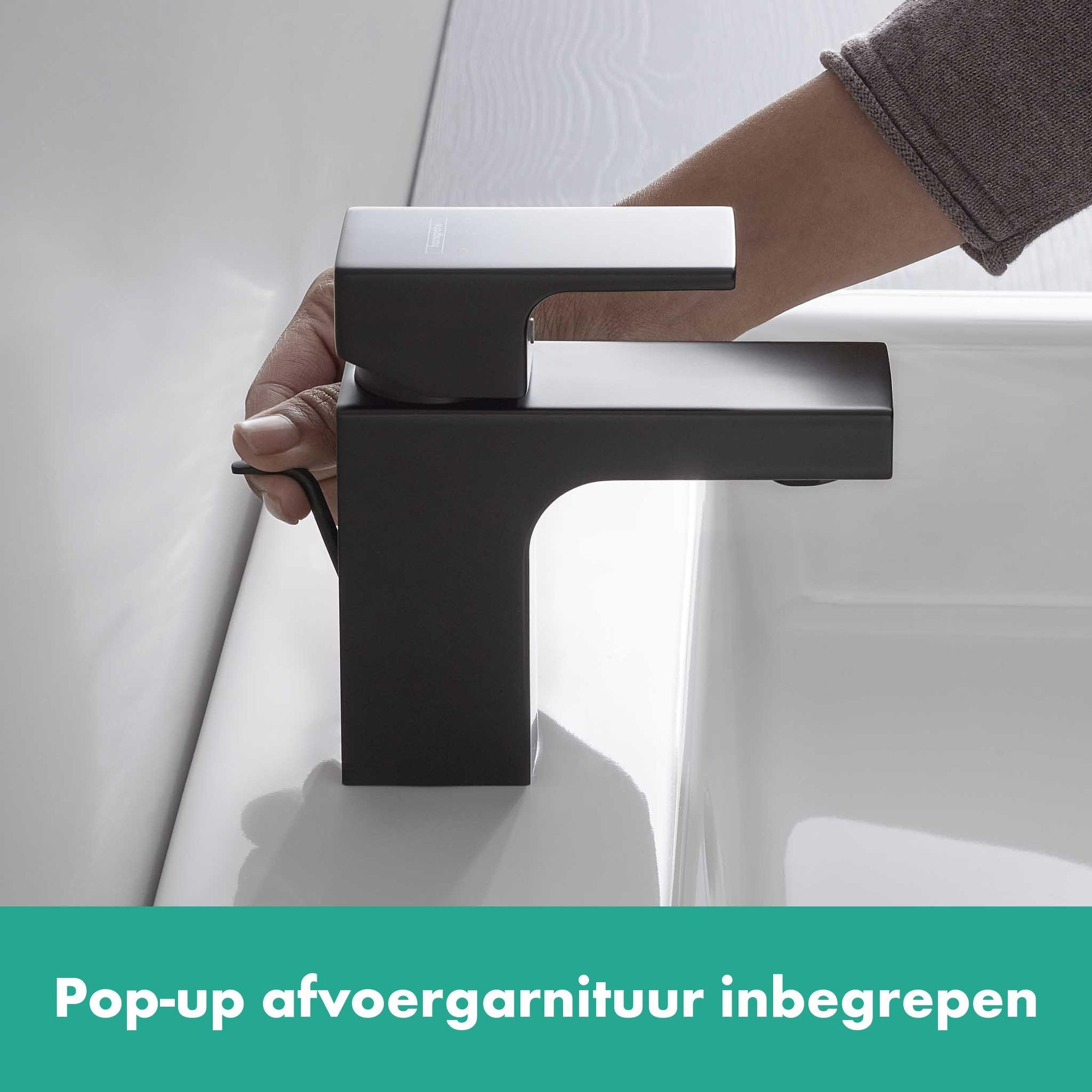 De Vernis Shape ééngreeps wastafelmengkraan 70 met pop-up afvoergarnituur maakt indruk op gebruikers door de mooie mix van ronde en hoekige vormen. Het onderscheidende design in trendy mat zwart maakt de kraan van zink de perfecte partner in de fontein, en al helemaal in moderne badkamers of gastentoiletten. Wat is er zo speciaal aan deze kraan? De interne watervoering voorkomt dat drinkwater in contact komt met het metaal van de kraan. De robuuste kunststof pop-up afvoergarnituur wordt meegeleverd en kan makkelijk met één hand geopend en gesloten worden. De Vernis Shape kranen brengen tijdloos design en de bewezen hansgrohe gebruiksvriendelijkheid de badkamer binnen en zijn beschikbaar voor een aantrekkelijke prijs.