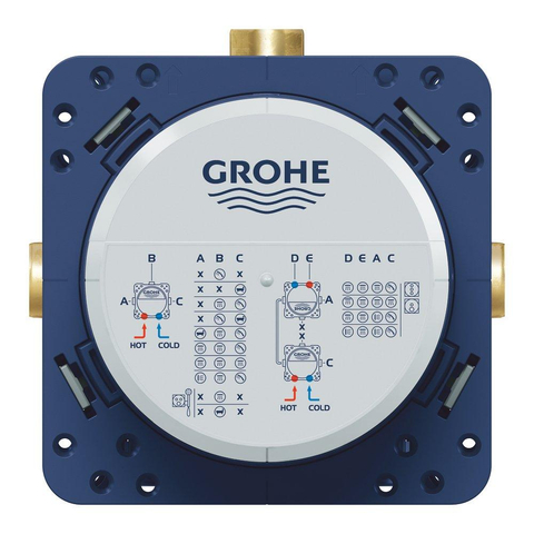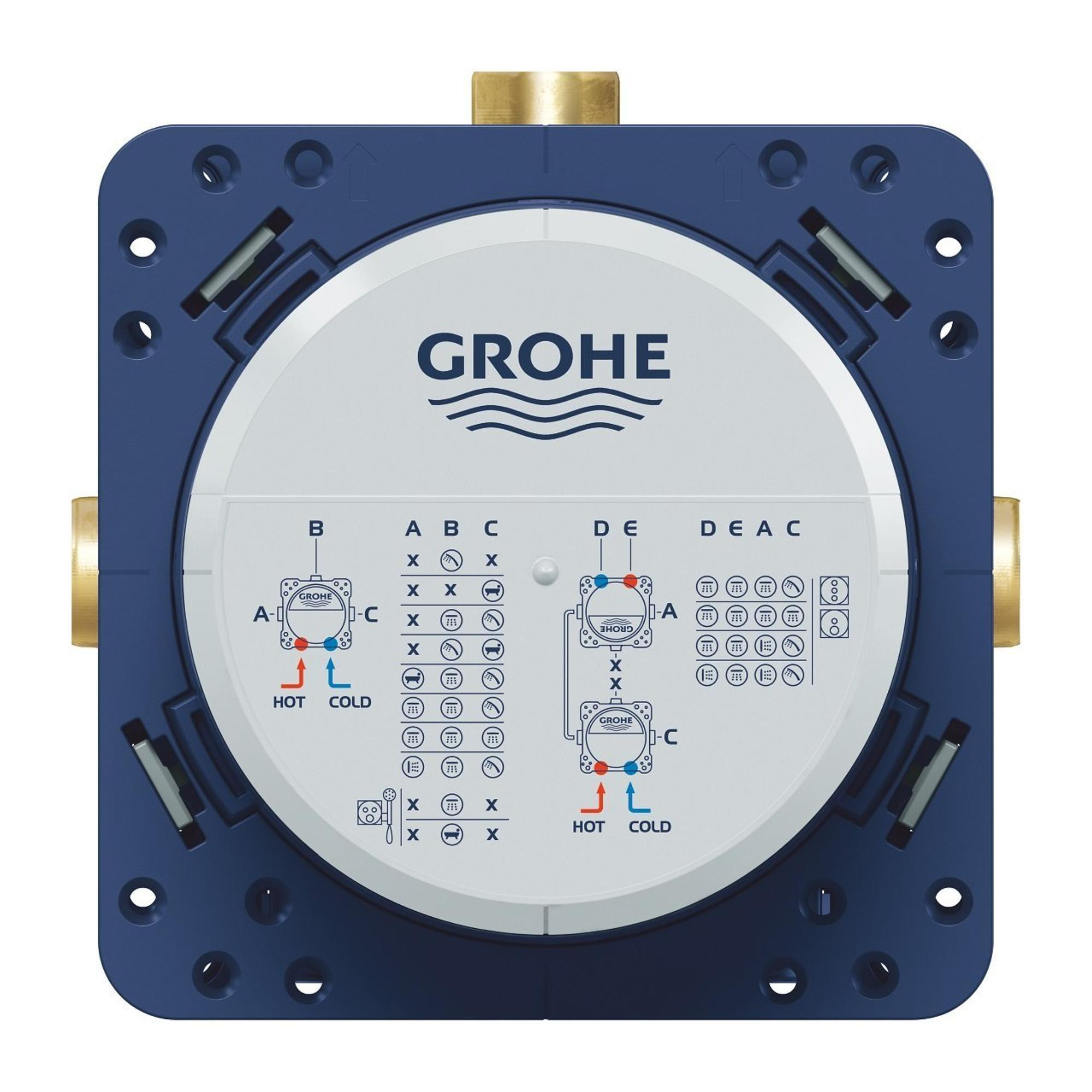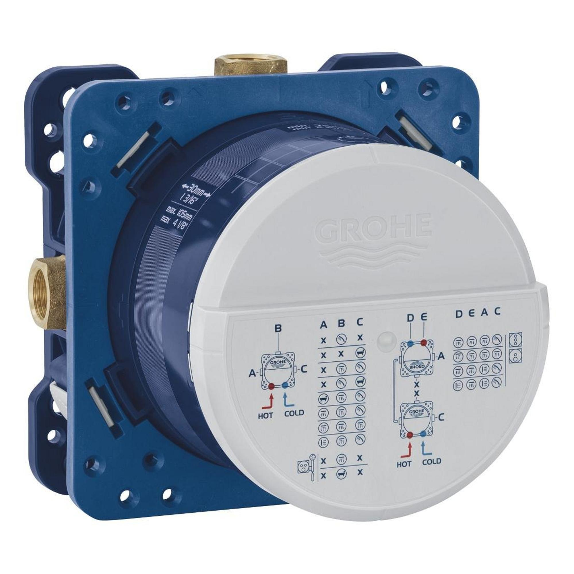 De GROHE Rapido SmartBox is een universele inbouwbox die flexibiliteit en functionaliteit combineert voor een efficiënte installatie. Dankzij de slimme constructie is deze box geschikt voor verschillende toepassingen en biedt hij een solide basis voor jouw douche- of badkraan.Deze inbouwbox heeft drie uitgangen (1/2") en twee inlaten aan de onderzijde (1/2"). De installatiediepte varieert tussen 75 en 105 mm, waardoor hij in diverse situaties toepasbaar is. Het kraanhuis is vervaardigd uit hoogwaardig messing, wat zorgt voor een lange levensduur en betrouwbaarheid. De voorgemonteerde spoelstop (flushing plug) vereenvoudigt de installatie en voorkomt verontreiniging tijdens de bouwfase.