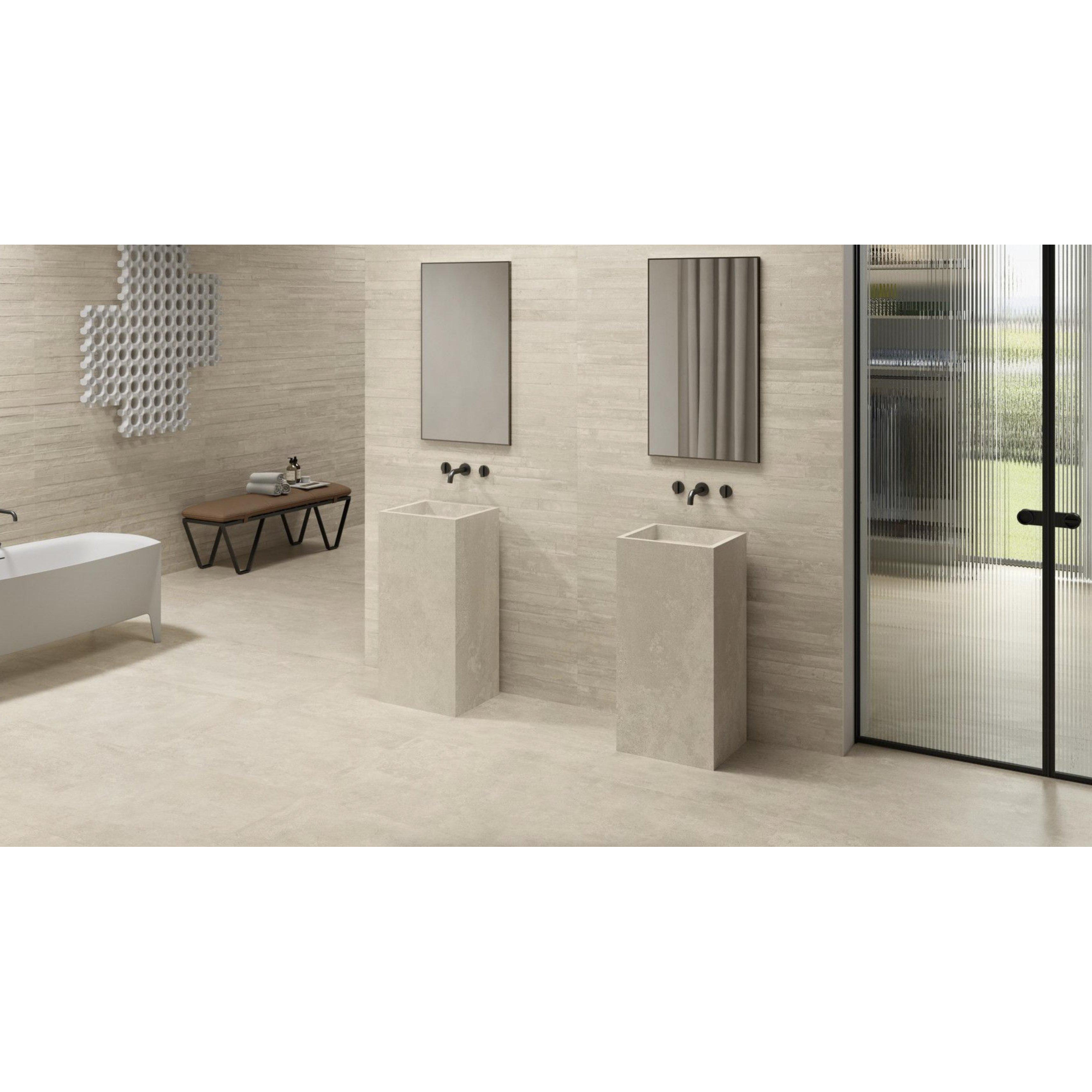 De Vtwonen Raw Vloer- en wandtegel 60x120cm 9.5mm R10 porcellanato Sand is een prachtige toevoeging aan elke badkamer of keuken. Met zijn elegante ontwerp en hoogwaardige afwerking, straalt deze tegel klasse en stijl uit. De subtiele zandkleur voegt een warme en uitnodigende sfeer toe aan de ruimte, terwijl de porcellanato afwerking zorgt voor duurzaamheid en gemak in onderhoud. Of je nu op zoek bent naar een vloer- of wandtegel, deze tegel voldoet aan al je behoeften en voegt een vleugje luxe toe aan je interieur.
