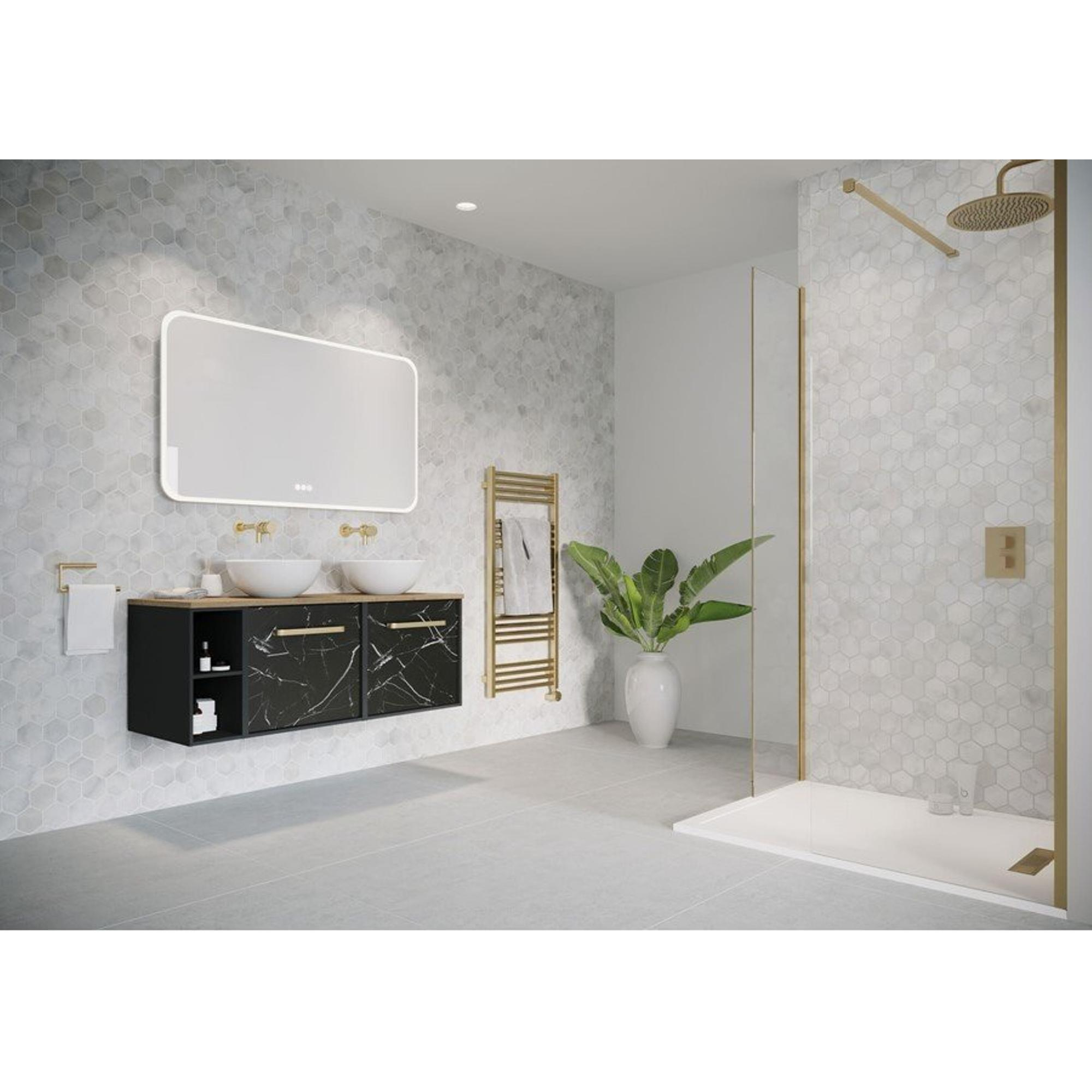 De Crosswater MPRO Elektrische handdoekradiator straalt pure luxe uit. De geborsteld messing (goud) afwerking geeft een gevoel van elegantie en verfijning aan de ruimte. Het hoogwaardige materiaal en de duurzame constructie zorgen voor een langdurige en luxueuze toevoeging aan je badkamer. Deze radiator is niet alleen een functioneel element, maar ook een statement van luxe en comfort.