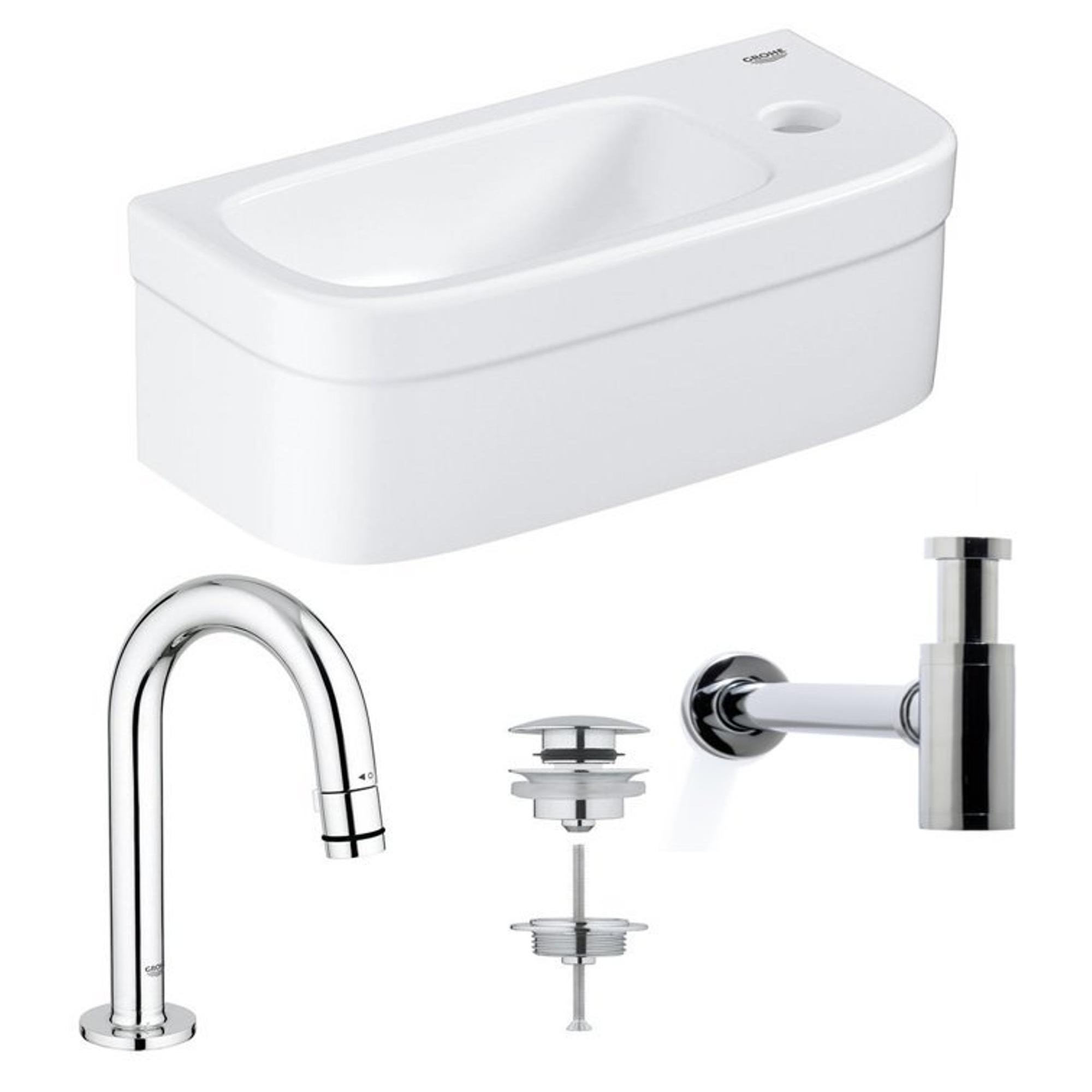 GROHE Euro fonteinset 37x18cm gebogen GROHE kraan Saniclass sifon afvoerplug Chroom Wit
