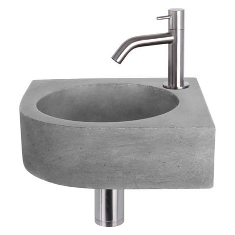 ?Het plaatsbesparende donker betonnen wasbakje Cleo heeft het kraangat in de hoek, zodat hij in de hoek te plaatsen is. Het betonnen materiaal is zeer stevig en heeft een waterdichte coating. Beton zorgt voor een industri?le uitstraling en is goed te combineren met de diverse beschikbare kleuren kranen, afvoerpluggen en sifons.