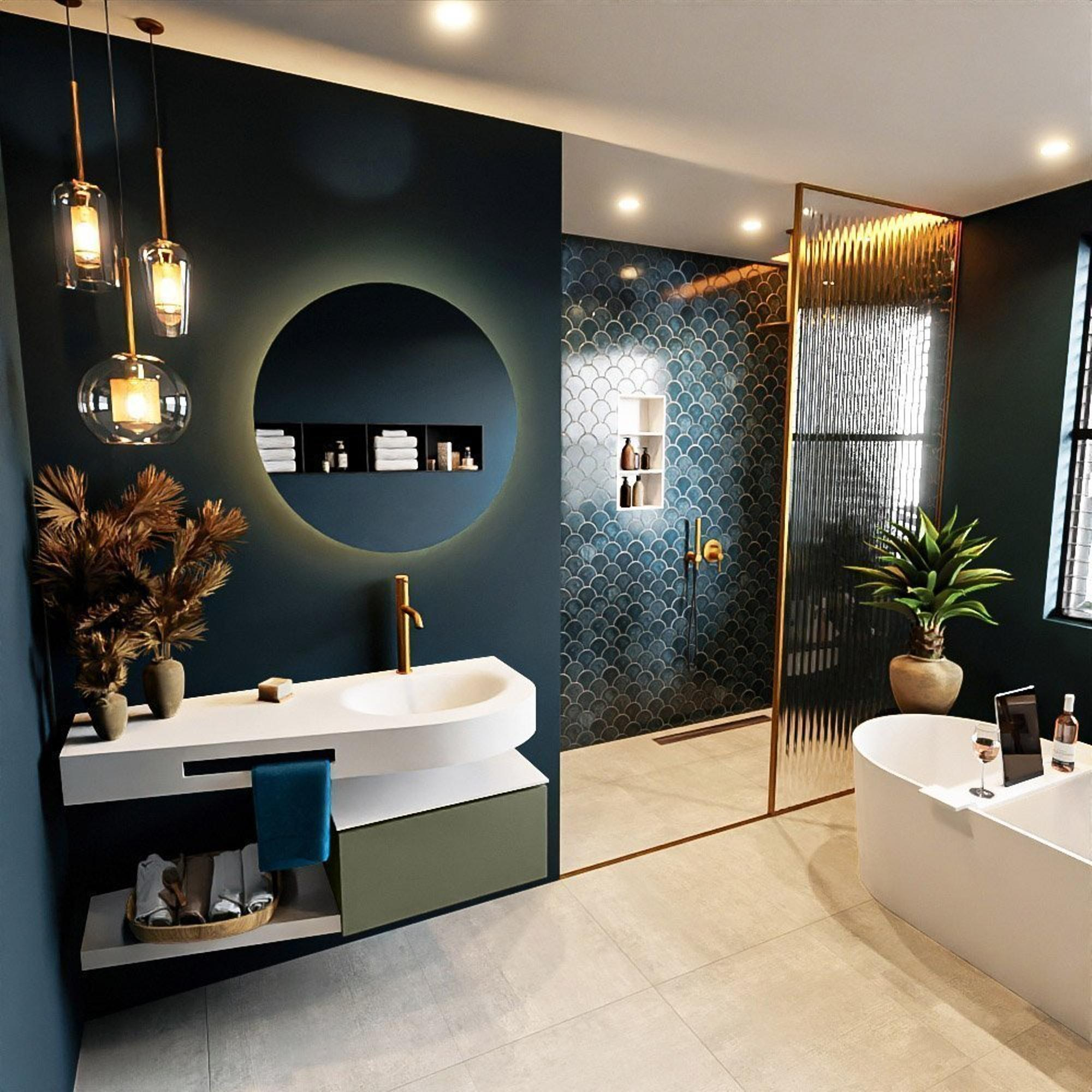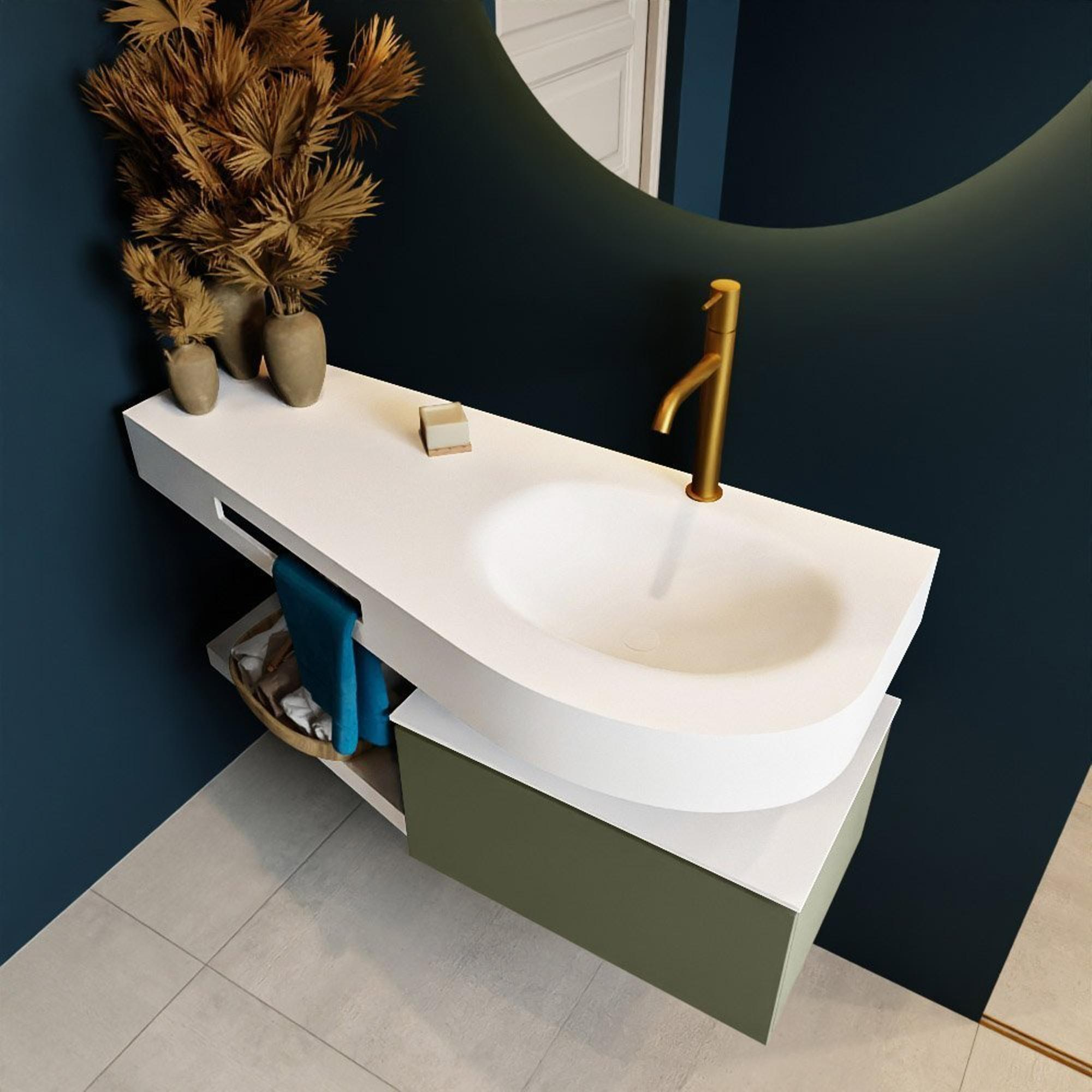 MONDIAZ RIVA Badkamermeubelset - 120x50x30cm - 1 lade - MDF Army mat - push to open - 1 kraangat - wasbak rechts - solid surface talc